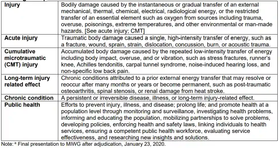 表 1. DoD军事伤害工作组提出的伤害定义和相关术语