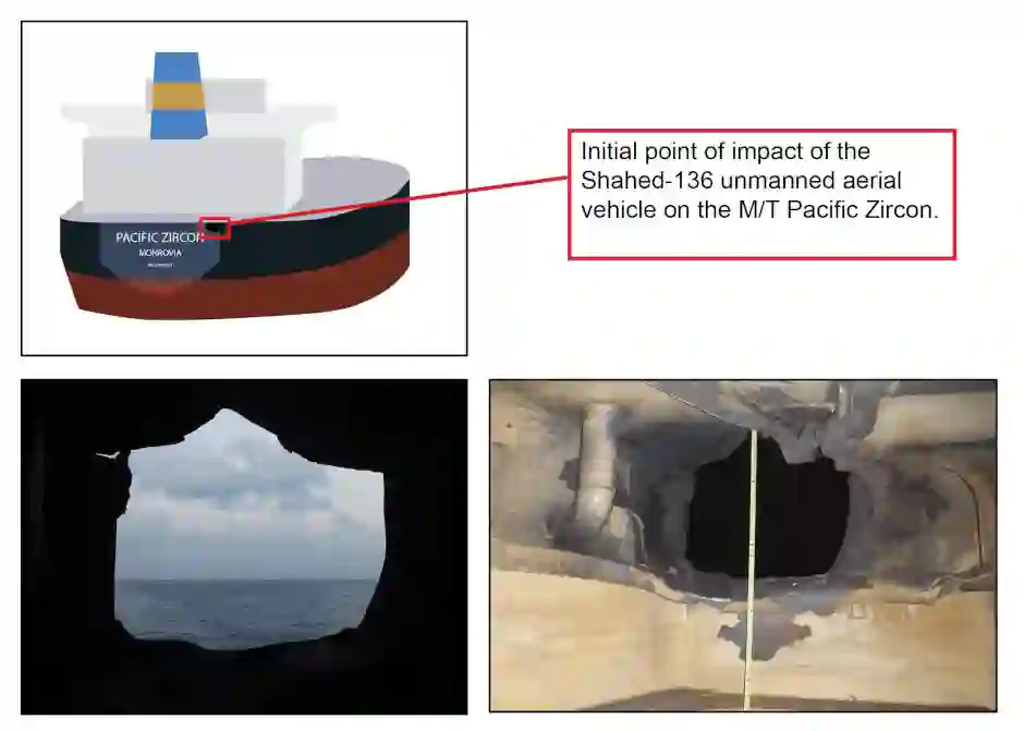 这并不是伊朗第一次使用它们。一年前的 2022 年 11 月 15 日,另一艘与以色列相连的油轮Pacific Zircon在阿曼附近海域遭到类似袭击。这两起袭击事件的相似之处非常明显。