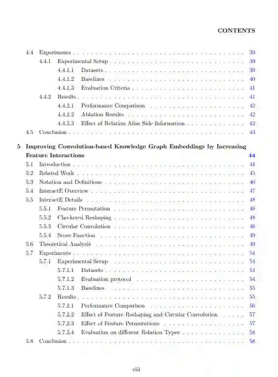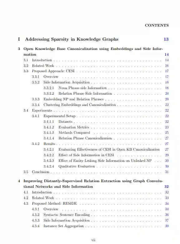 图无处不在,从引文和社交网络到知识图谱(KGs)。它们是最富表现力的数据结构之一,已被用于建模各种问题。知识图谱是图中事实的结构化表示,其中节点表示实体,边表示实体之间的关系。最近的研究已经开发出几种大型知识图谱;例如DBpedia、YAGO、NELL和Freebase。然而,它们都是稀疏的,每个实体只有很少的事实。例如,每个实体只包含1.34个事实。在论文的第一部分,我们提出了缓解这一问题的三个解决方案:(1)KG规范化,即(2)关联提取,它涉及到从非结构化文本中提取实体之间的语义关系的自动化过程;(3)链接预测,它包括基于KG中的已知事实推断缺失的事实。KG的规范化,我们建议CESI(规范化使用嵌入和边信息),一个新颖的方法执行规范化学习嵌入开放KG。KG嵌入的方法扩展了最新进展将相关NP和关系词信息原则的方式。对于关系提取,我们提出了一种远程监督神经关系提取方法,该方法利用KGs中的附加边信息来改进关系提取。最后,对于链路预测,我们提出了扩展ConvE的InteractE,这是一种基于卷积神经网络的链路预测方法,通过三个关键思想:特征置换、新颖的特征重塑和循环卷积来增加特征交互的次数。通过对多个数据集的大量实验,验证了所提方法的有效性。