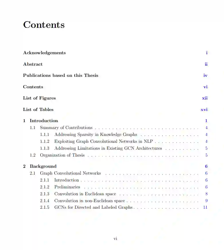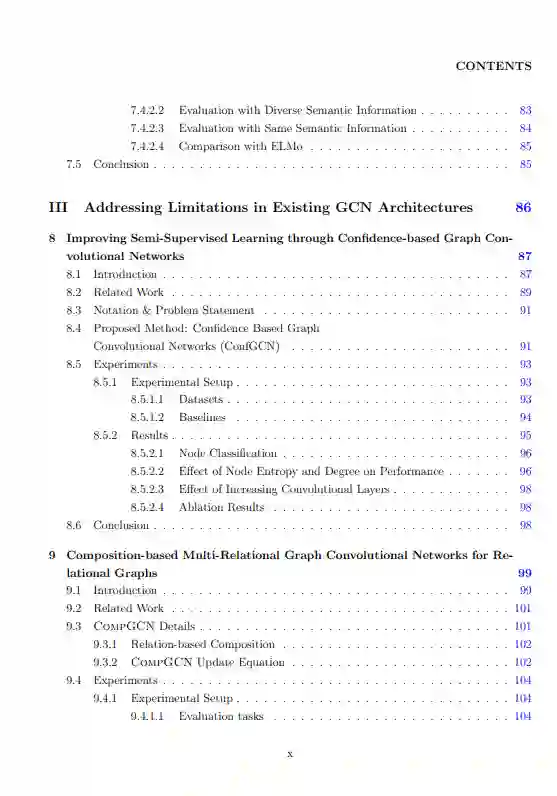 为此,我们提出利用GCNs联合开发文档语法和时态图结构的NeuralDater,以获得该问题的最新性能。提出了一种灵活的基于图卷积的词嵌入学习方法——SynGCN,该方法利用词的依赖上下文而不是线性上下文来学习更有意义的词嵌入。在论文的第三部分,我们讨论了现有GCN模型的两个局限性,即(1)标准的邻域聚合方案对影响目标节点表示的节点数量没有限制。这导致了中心节点的噪声表示,中心节点在几个跃点中几乎覆盖了整个图。为了解决这个缺点,我们提出了ConfGCN(基于信任的GCN),它通过估计信任来确定聚合过程中一个节点对另一个节点的重要性,从而限制其影响邻居。(2)现有的GCN模型大多局限于处理无向图。然而,更一般和更普遍的一类图是关系图,其中每条边都有与之关联的标签和方向。现有的处理此类图的方法存在参数过多的问题,并且仅限于学习节点的表示。我们提出了一种新的图卷积框架CompGCN,它将实体和关系共同嵌入到一个关系图中。CompGCN是参数有效的,并且可以根据关系的数量进行扩展。它利用了来自KG嵌入技术的各种实体-关系组合操作,并在节点分类、链接预测和图分类任务上取得了明显的优势结果。