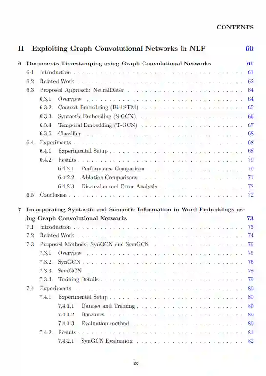 传统的神经网络如卷积网络和递归神经网络在处理欧几里得数据时受到限制。然而,在自然语言处理(NLP)中图形是很突出的。最近,图卷积网络(Graph Convolutional Networks, GCNs)被提出来解决这一缺点,并成功地应用于多个问题。在论文的第二部分,我们利用GCNs来解决文档时间戳问题,它是文档检索和摘要等任务的重要组成部分。