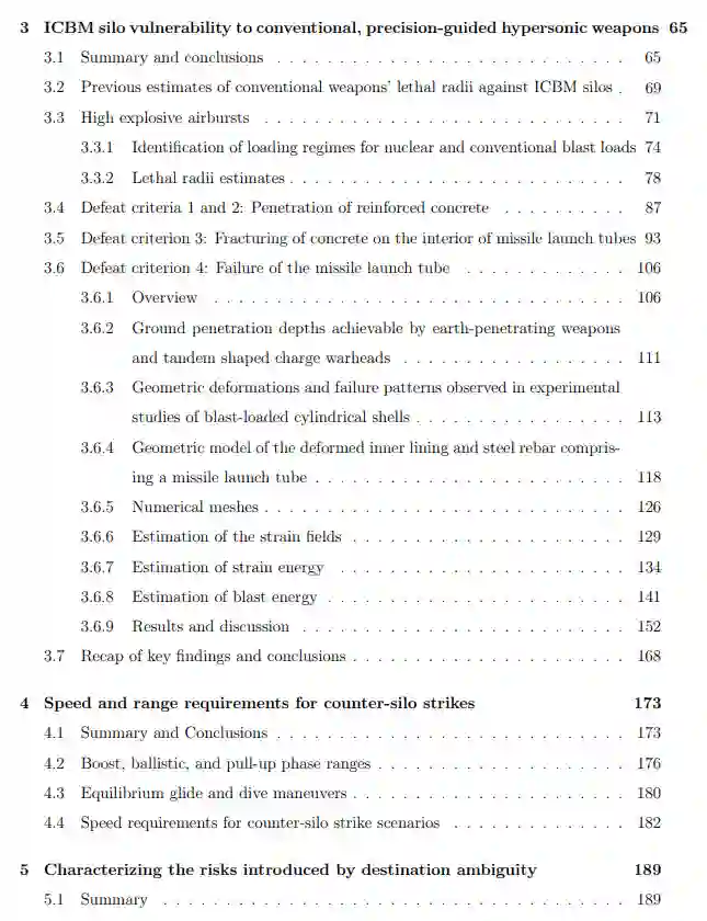第三章对第二章提出的常规战斗部杀伤半径进行估算,确定有效实施反发射井打击所需的武器精度水平。现有公开研究虽有个别杀伤半径估算案例,但其可靠性存疑:这些研究或采用错误物理模型,或对毁伤机制处理过度简化,亦未考虑材料组成与发射井几何结构的空间异质性。本研究改进上述缺陷后得出新结论:侵彻武器只要命中发射井顶部表面即可摧毁目标,对应杀伤半径近似等于发射井半径;若使用高超音速动能武器,即使偏离目标1-3米仍具毁伤能力。据此推算,此类武器威胁发射井所需的精度要求低于或相当于美国高超音速武器既定性能目标,且显著优于现役多数精确制导武器。