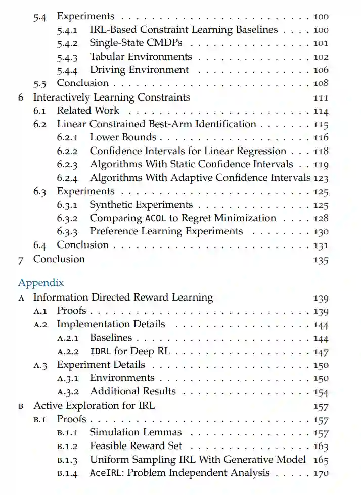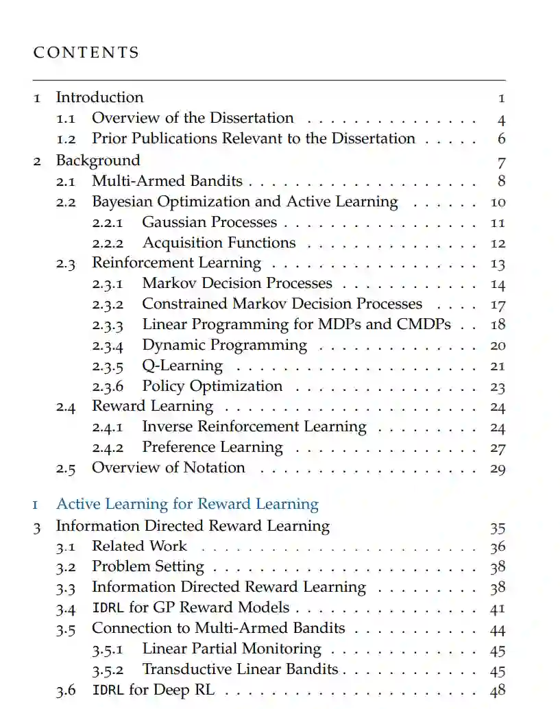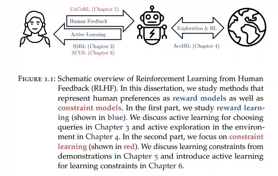 本论文分为两部分。第一部分关注学习奖励模型。我们提出了一种针对主动奖励学习的通用方法,该方法专注于学习一个好的策略,而不仅仅是减少近似误差(第3章),以及一种主动探索环境以收集数据并向专家查询的方法(第4章)。第二部分关注学习约束模型。我们认为约束可能是学习人类偏好的特别有用的表示,并提出了从一组带有未知奖励的示范中学习约束的方法(第5章),以及从关于轨迹安全性的反馈中主动学习约束的方法(第6章)。 图1.1概述了我们的贡献如何与典型的RLHF设置的不同部分相关。在以下内容中,我们总结了各章节的贡献。