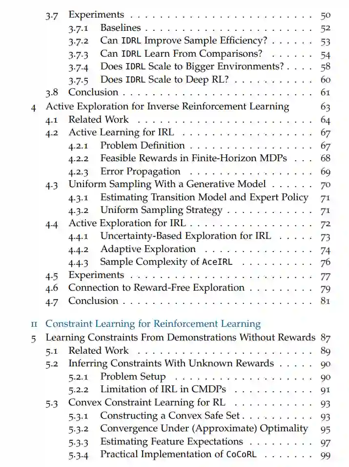 在许多安全关键的强化学习应用中,如机器人技术,约束是至关重要的。我们认为,在这样的领域中,我们应该从人类反馈中学习约束模型,而不仅仅是学习奖励模型。为了实现这一点,我们开发了算法来有效地学习约束,从而解答了我们的第二个研究问题。首先,我们专注于从带有未知奖励的示范中学习约束。其次,我们结合这种方法和主动学习来开发一种算法,从人类反馈中主动学习约束。