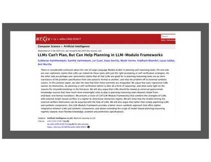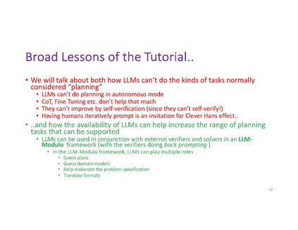 本教程将指出LLMs在生成通常需要通过组合搜索解决子目标交互的计划时的根本限制,并展示LLMs作为补充技术与AI规划社区开发的可靠规划器的建设性用途。除了介绍我们在这一领域的工作,我们还提供了许多相关努力的批判性综述,包括规划社区之外的研究人员的工作。 The preliminary list of topics to be covered in this tutorial includes: 1. Background on LLMs, and patterns of LLM use–including prompting techniques 1. Differentiating the use of transformer architectures vs. Pre-trained LLMs in planning