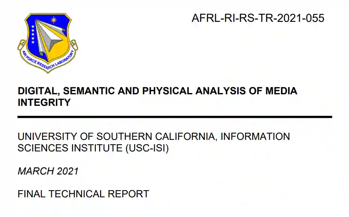 本报告总结了 DiSPARITY 团队开发的数字、物理和语义图像取证与完整性方法,该团队由南加州大学信息科学研究所领导,在 2016 年至 2020 年期间参与了 DARPA 的媒体取证计划。DiSparity 团队开发了各种先进的数字完整性方法(如 NoisePrint、GAN 指纹和 ManTra-Net)和物理完整性方法(如无分割光方向估计和入射光方向分析)。