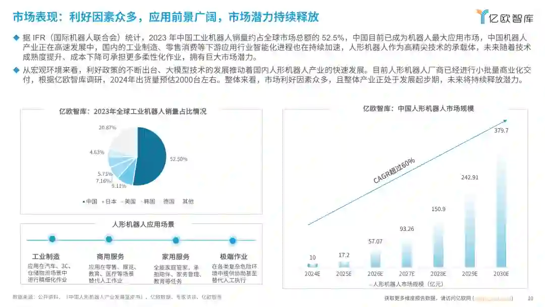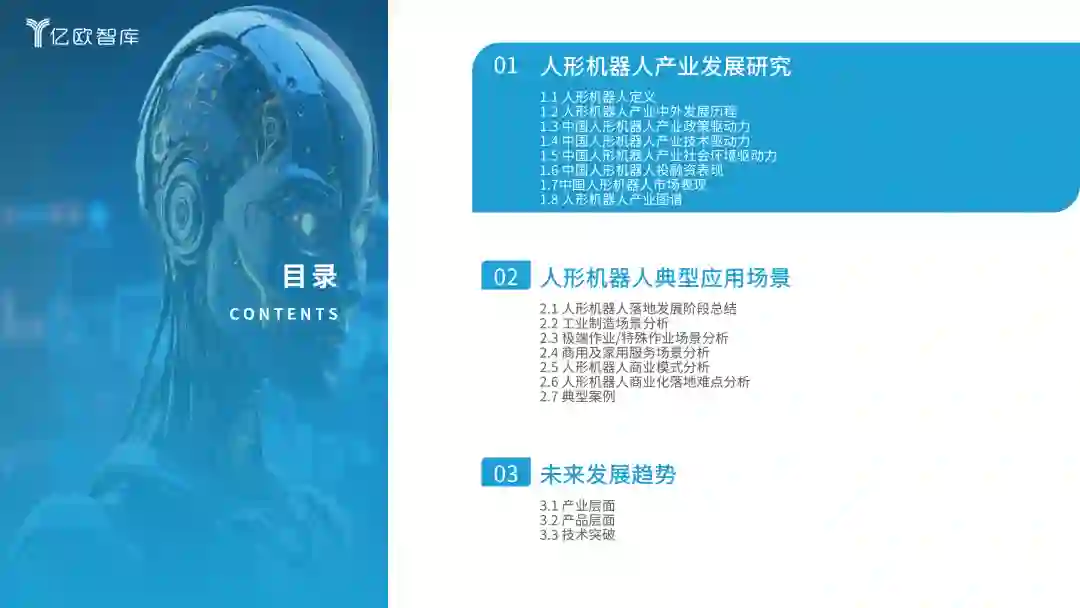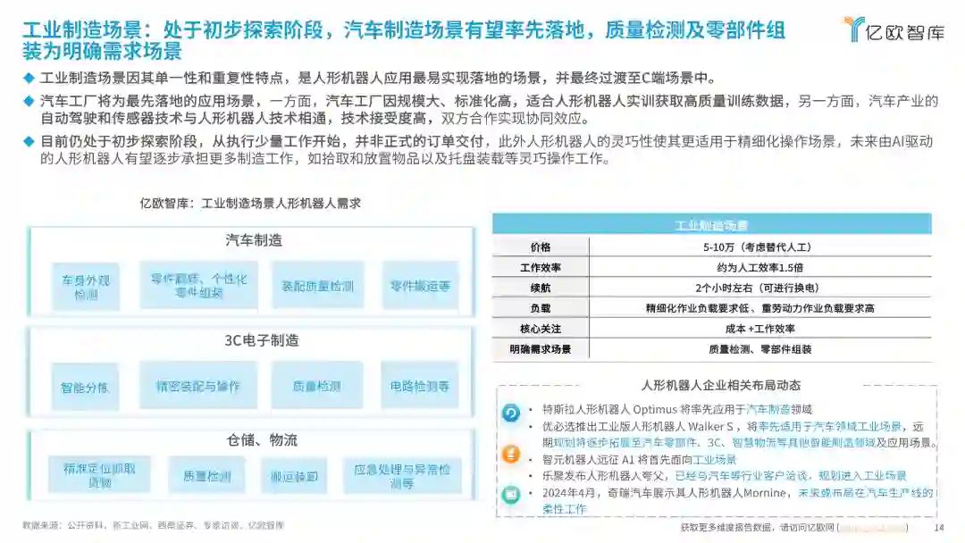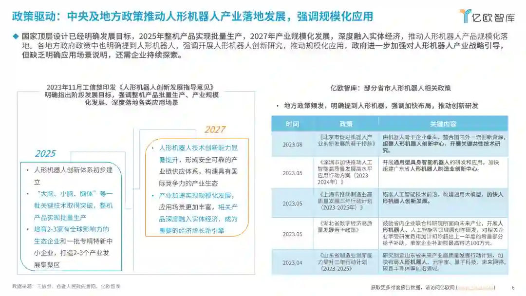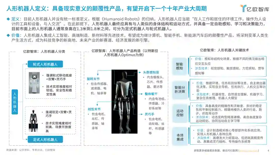 人形机器人是新质生产力的重点领域,集成人工智能、高端制造、新材料等先进技术,有望成为下一个颠覆性产品,引领新的产业变革。该报告对人形机器人产业发展历程、宏观环境,产业链进行分析,对人形机器人的场景应用情况以及需求进行梳理分析,并对应用落地短、中、长期情况进行总结,最后提出对未来趋势的研判。 以下为报告节选: