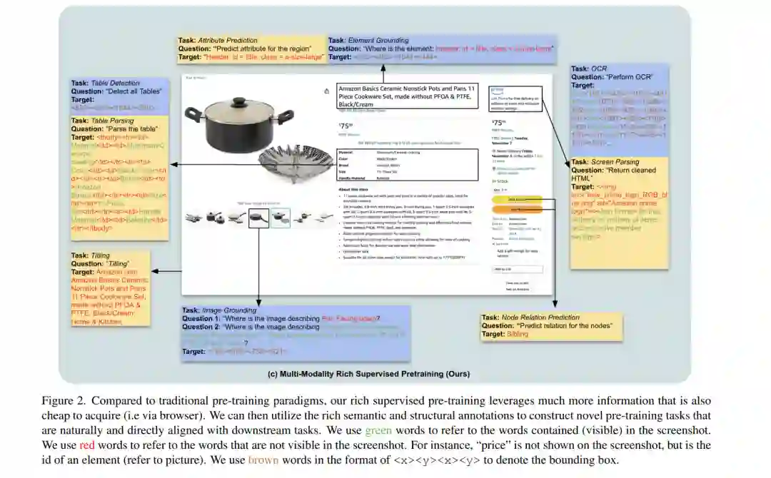 我们提出了一种新颖的预训练范式——强监督截屏预训练(S4),用于视觉-语言模型,该模型使用来自大规模网页截屏渲染的数据。使用网页截屏可以解锁视觉和文本提示的宝库,这些提示在使用图像-文本对时不存在。在S4中,我们利用HTML元素的固有树结构层次和空间定位,精心设计了10个预训练任务,这些任务具有大规模注释数据。这些任务类似于不同领域的下游任务,且注释获取成本低。我们证明,与当前的截屏预训练目标相比,我们创新的预训练方法显著提升了图像到文本模型在九个不同且流行的下游任务中的性能——在表格检测上提高了高达76.1%的性能,并且在小部件标题生成上至少提高了1%。