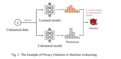 尽管机器遗忘的目标是保护数据隐私,但最近研究人员发现遗忘方案可能会以意想不到的方式危及隐私。这是因为当前大多数机器遗忘方案应用了机器学习算法,从而继承了这些算法的自然弱点或缺陷。Chen等人【12】指出,遗忘前后两个模型输出分布的差异可能导致被遗忘数据的额外信息泄露,这极大地挑战了遗忘算法的设计。例如,在数据驱动的方案中,划分原始训练集可以通过重新训练受影响的子模型来提高效率。通过聚合操作,重新训练的子模型的预测结果会反映在置信向量中,从而导致已学习和已遗忘模型输出的差异,这可能导致暴露关于已遗忘数据的成员信息的隐私违规。当攻击者查询已学习和已遗忘模型时,可以获得已遗忘数据后验概率的差异,并用于确定已遗忘数据是否为已学习模型训练集的成员。此过程如图1所示。 目前尚无明确的机器遗忘隐私风险定义。现有的综述未充分呈现当前机器遗忘方案的隐私问题。利用机器遗忘需要进一步分析和总结,特别是涉及隐私攻击和保护时。因此,我们认为有必要对机器遗忘的隐私问题进行更全面和系统的综述。通过总结和比较当前的遗忘方案,我们可以更深入地了解每种方法的优缺点,并涉及遗忘的性能评估和实际应用,以确定未来的研究方向。这些系列分析可以帮助当前研究人员、模型所有者和数据所有者意识到机器遗忘方案的现有隐私风险,同时警示未来的潜在隐私风险。 除了强调隐私威胁并讨论每种遗忘方案的脆弱性外,我们还提供了带有潜在隐私风险的遗忘方法的明确分类法,并总结了潜在的防御方法以及流行应用中的风险。