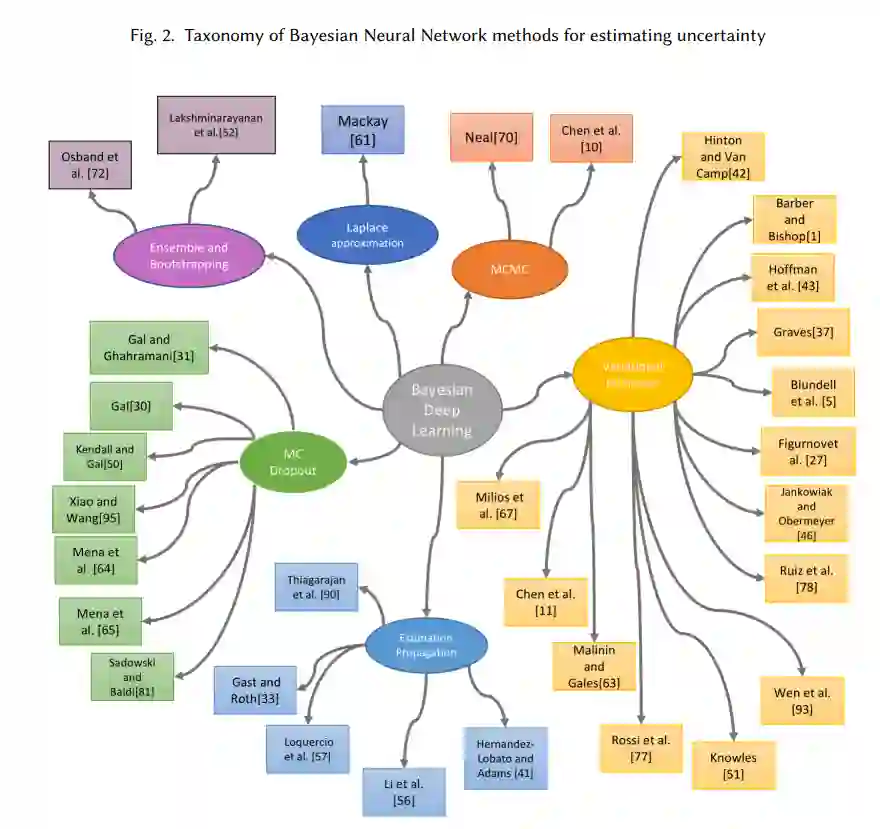 本文的附加价值有三个方面。首先,与Gal[28]不同的是,他专注于回归问题中的不确定性估计,我们处理分类问题,调查了一系列方法,从最早的基于Dropout的方法到更新颖的技术,如在单纯线上建立连续分布模型。其次,我们通过统一的贝叶斯视角来介绍各种方法,以利于理解。最后,我们不仅介绍了估计技术的最新进展,而且还介绍了关于其特性和在实际场景中使用的一些考虑。