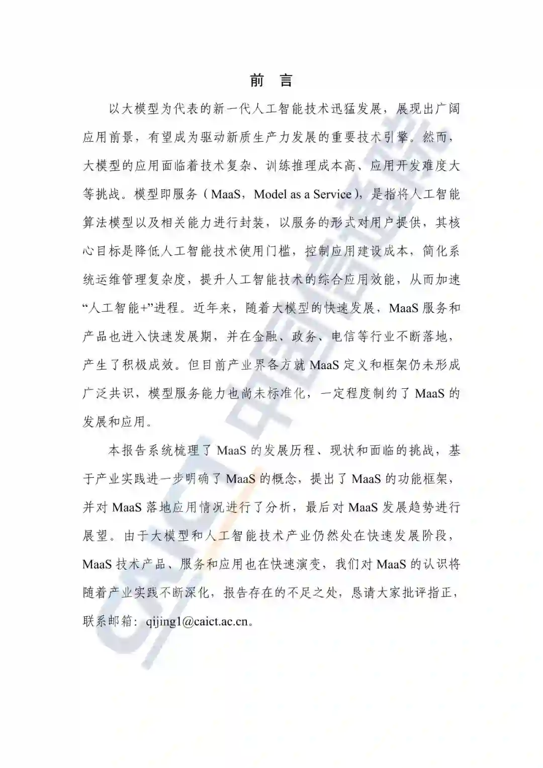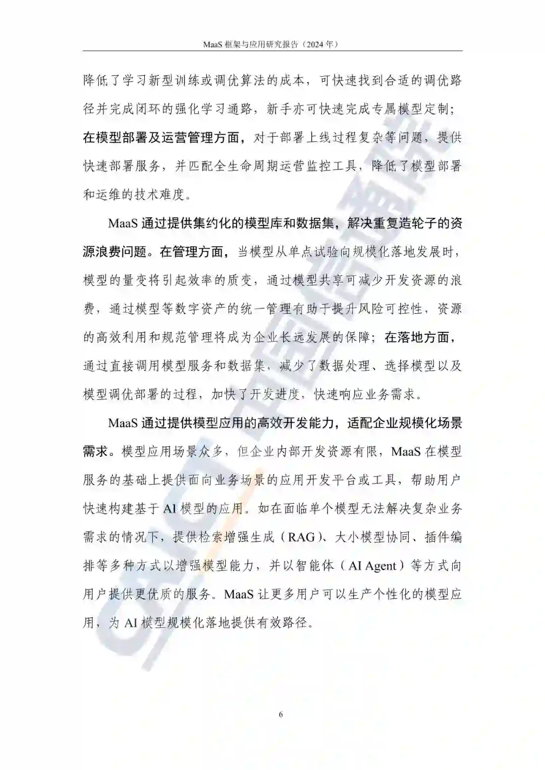 《MaaS框架与应用研究报告(2024年)》由中国信息通信研究院人工智能研究所与中国人工智能产业发展联盟联合发布,此报告详尽探讨了模型即服务(MaaS)的最新发展、挑战、框架与应用实践,是深入了解和把握人工智能技术商业化趋势,特别是大模型应用领域的权威指南。