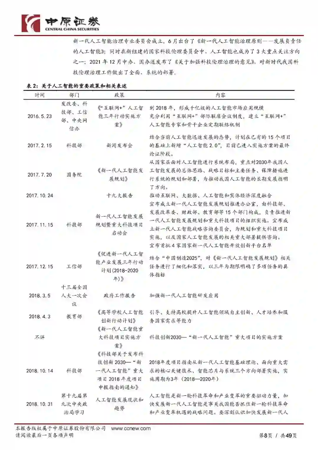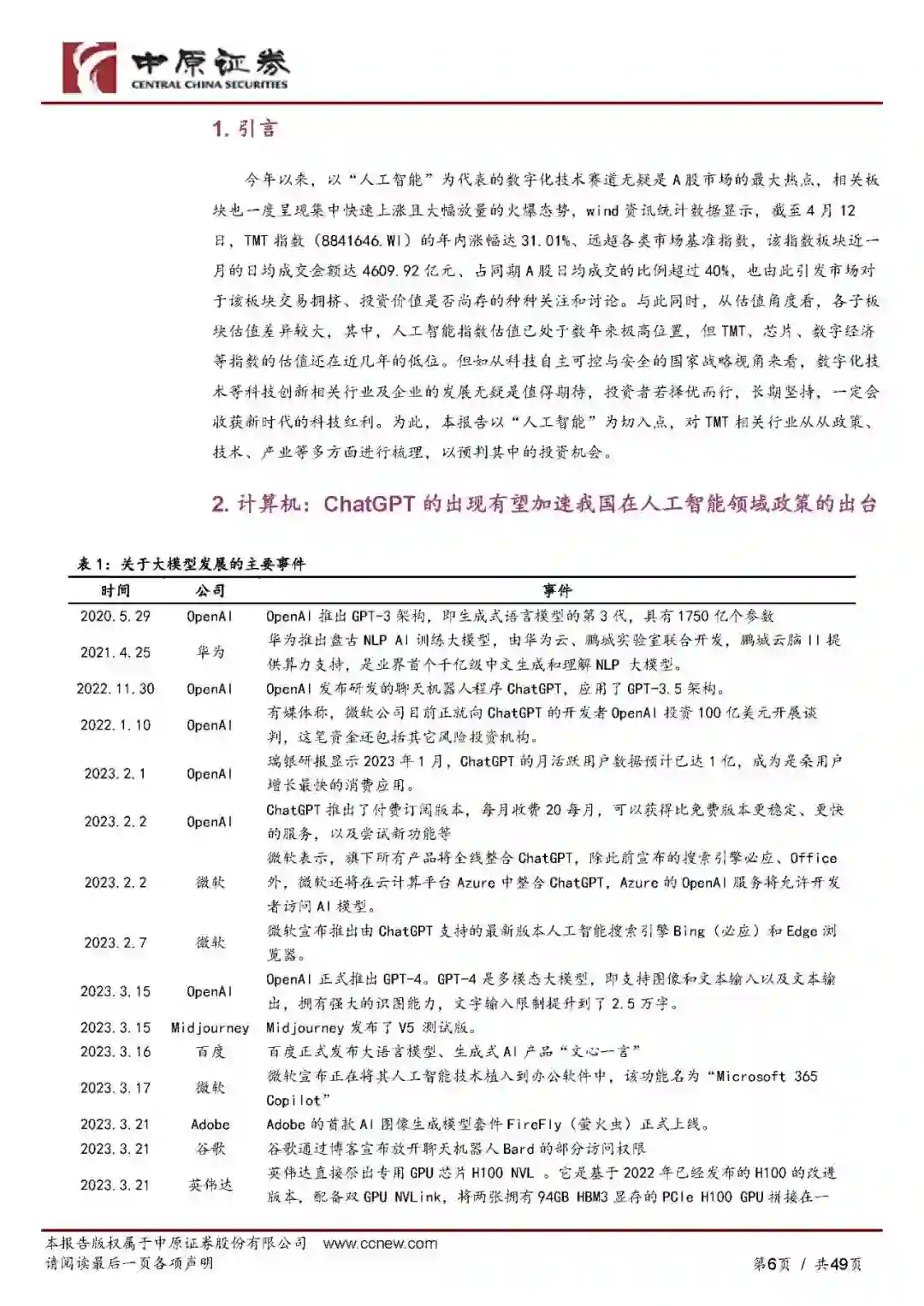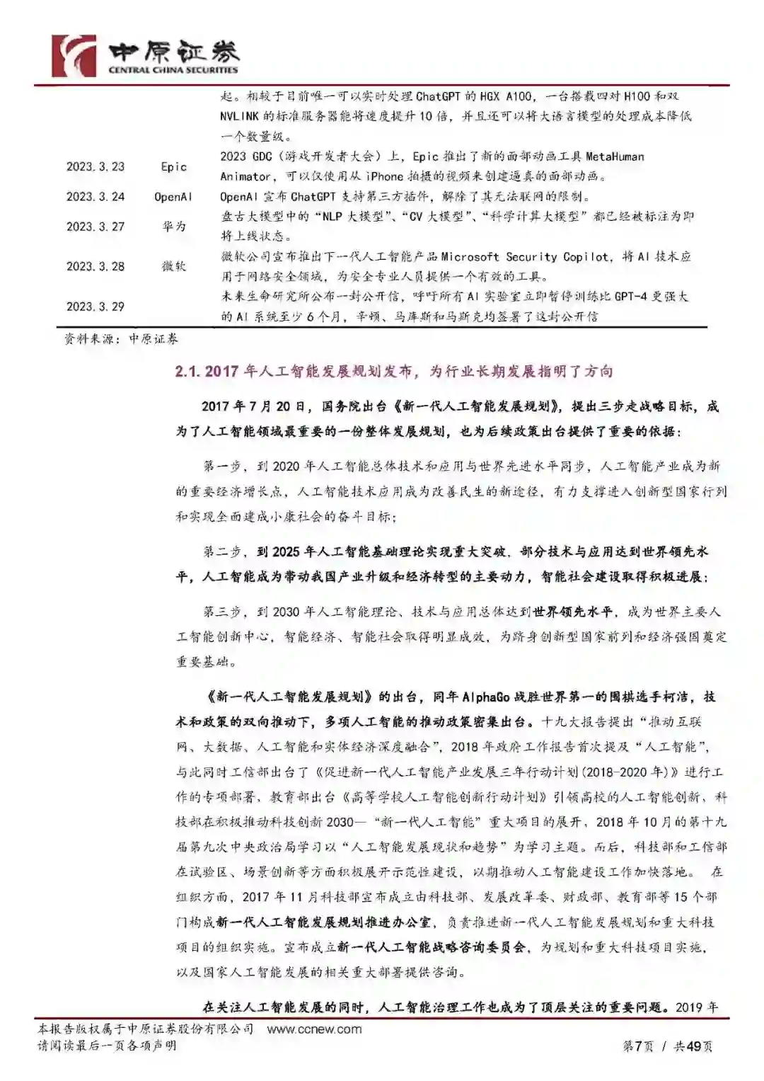 计算机:2017年7月国务院出台《新一代人工智能发展规划》,提出三步走战略目标,成为了人工智能领域最重要的一份整体发展规划,也为后续政策出台提供了重要的依据。同年AlphaGo战胜世界第一的围棋选手柯洁,技术和政策的双向推动下,多项人工智能的推动政策密集出台。考虑到当前人工智能技术再次取得重大突破,我们认为国家有望在相关方向上出台更多推动政策,助力国内产业跟随国际先进水平。 通信:作为发挥数据生产要素价值的关键驱动力,算力对经济增长的拉动具有长期性和倍增效应。数字中国建设和人工智能产业的发展对算力要求将为云计算基础设施带来较大增量。光模块作为数据中心关键零部件,行业具备新产品升级周期驱动特征。随着AI应用和云计算的高速发展以及传统企业数字化转型的需要,海量数据对网络带宽提出新的要求,有望带动配套高速光模块的需求提升。此外,受益于ChatGPT带来的算力需求激增,行业景气度提升,配置价值显现,板块迎来布局良机。运营商凭借原有网络和数据中心等基础设施优势,算力运维成本得以大幅下降。电信运营商以通信网络为基础、以数据资源为核心、以信息技术为动能,作为数字经济的中坚力量,AI时代国家队代表,算力网络建设先锋,有望充分获益。受益于AI产业和产业数字化转型,运营商以B端为主力增长点,产业数字化业务成为第二成长曲线,未来成长空间广阔。 电子:AIGC模型预训练数据量呈指数级增长,带动算力需求爆发。人工智能的各类应用场景,从云端溢出到边缘端,或下沉到效支撑,算力基础设施云、边、端AI芯片作为算力载体,将迎来高速成长期。云端AI芯片是AI服务器算力的核心组成,英伟达主导云端AI计算市场,美国限制高端GPU供应,国产GPU芯片厂商迎来黄金发展期;AI芯片专用于人工智能领域,国产AI芯片厂商迎来高速发展期。随着人工智能、5G、物联网等技术的逐渐成熟,算力需求从云端不断延伸至边缘,带动边缘计算服务器和边缘端智能芯片市场稳步增长。国内边缘端智能芯片厂商崛起,部分产品性能指标已可对标海外龙头厂商。AIGC有望加速智能在终端上的应用,终端AI芯片迎来升级与发展机遇。 传媒:目前的AI技术的应用已经从最初的数据分析突破到创意性内容的生成,优秀的内容生成能力引发了大范围的关注,GPT-4、Midjourney等AIGC类应用产品的快速迭代和更新表明了AIGC的发展已经步入快车道并正在为内容创作领域带来深刻的变革。随着算法、模型、算力的持续优化,未来的AIGC将实现更加高质量的内容产出,当前技术成熟度相对欠缺的长文本生产、视频生成以及横跨更多模态的多模态生成等方面也将逐一被突破、解决,进一步扩大AIGC技术的应用范围和普及率。短期来看,我们认为在目前的AIGC的应用场景之中,游戏行业市场规模大、商业化成熟度高,所涉及的代码、绘图、音乐、策划、测试等多个内容创作环节均能够与AI技术进行比较好的融合,将率先成为AIGC技术的核心应用场景和投资主线之一。AI技术也为游戏产业带来了更多的产品附加值,通过与前沿科技的相互融合共同发展,为游戏产业的不断注入创新发展的动力,建议密切关注“AI+游戏”的结合落地情况,由AI技术所带来的创新玩法体验以及游戏公司研发的降本增效将成为验证AI技术在游戏产业应用情况的重要指标。