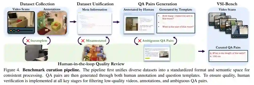 此外,本文还开发了一个复杂的基准构建流程,以有效地大规模生成高质量问答(QA)对,如图 4 所示。
