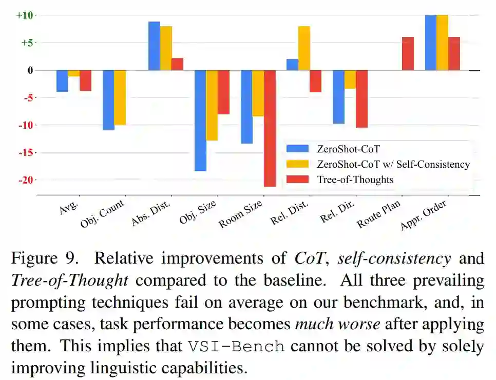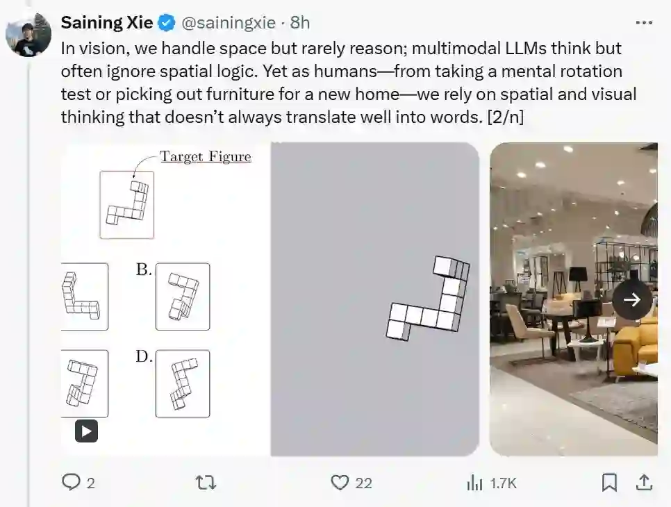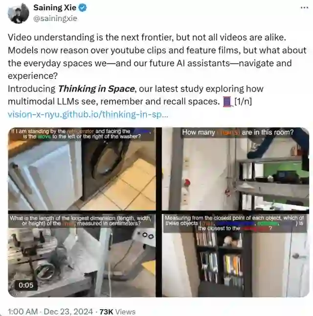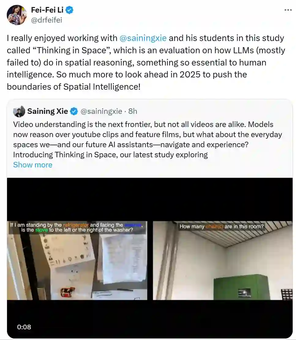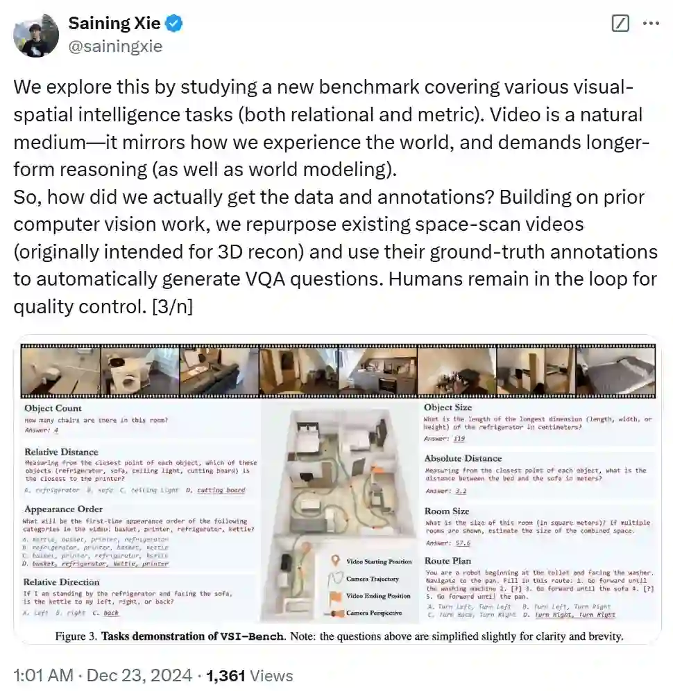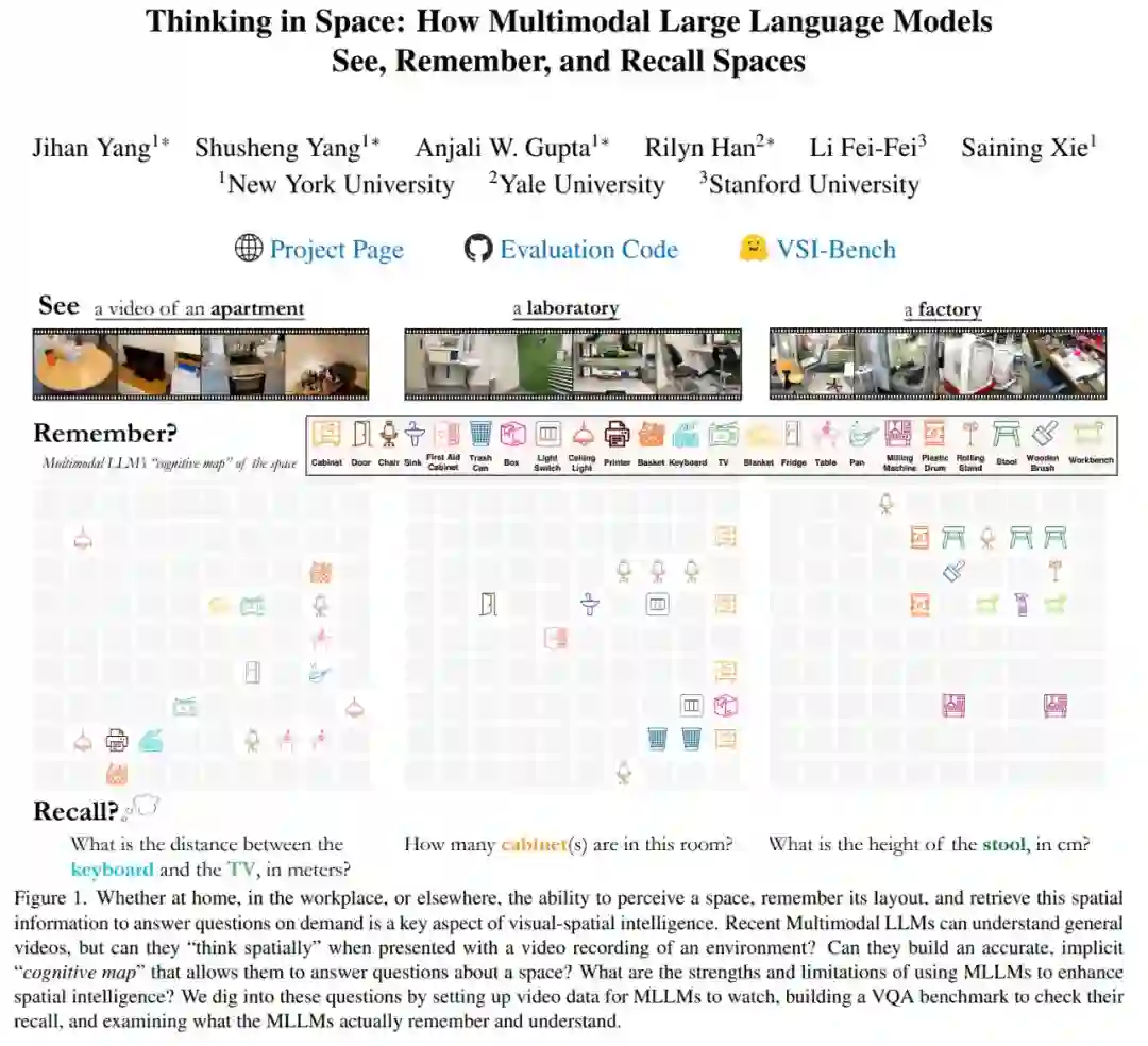 机器之心报道机器之心编辑部希望 2025 年 AI 领域能带来推理之外的突破。 在购买家具时,我们会尝试回忆起我们的客厅,以想象一个心仪的橱柜是否合适。虽然估计距离是困难的,但即使只是看过一次,人类也能在脑海里重建空间,回忆起房间里的物体、它们的位置和大小。我们生活在一个感官丰富的 3D 世界中,视觉信号围绕着我们,让我们能够感知、理解和与之互动。这是因为人类拥有视觉空间智能(visual-spatial intelligence),能够通过连续的视觉观察记住空间。然而,在百万级视频数据集上训练的多模态大语言模型 (MLLM) 是否也能通过视频在空间中思考,即空间思维(Thinking in Space)?为了在视觉空间领域推进这种智能,来自纽约大学、耶鲁大学、斯坦福大学的研究者引入了 VSI-Bench,这是一个基于视频的基准测试,涵盖了近 290 个真实室内场景视频,包含超过 5000 个问答对。其中,视频数据是通过捕捉连续的、时间性的输入来完成的,不仅与我们观察世界的方式相似,而且比静态图像更能丰富空间理解和推理。在 VSI-Bench 上评估开源和闭源模型显示,尽管模型与人类之间存在较大的性能差距,尽管 MLLM 面临视频理解、文本理解和空间推理的挑战,但其仍展现出了新兴的视觉空间智能。为了对模型行为展开研究,本文受到双重编码理论的启发(该理论认为语言处理和视觉处理既有区别又相互补充),他们提出了用于自我解释(语言)和认知图(视觉)的选择模型(selected models)。