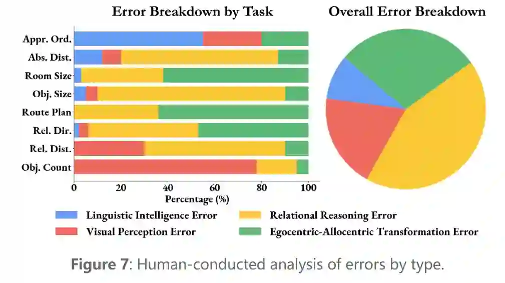 错误分析:对 VSI-Bench(tiny)上表现最佳的 MLLM 的错误进行分析,发现主要有四种错误类型:视觉感知、语言智能、关系推理和第一视角 - 他人视角转换。图 6 显示,71% 的错误源于空间推理,特别是在理解距离、大小和方向方面。这表明空间推理仍然是提高 VSI-Bench 上 MLLM 性能的关键瓶颈。
