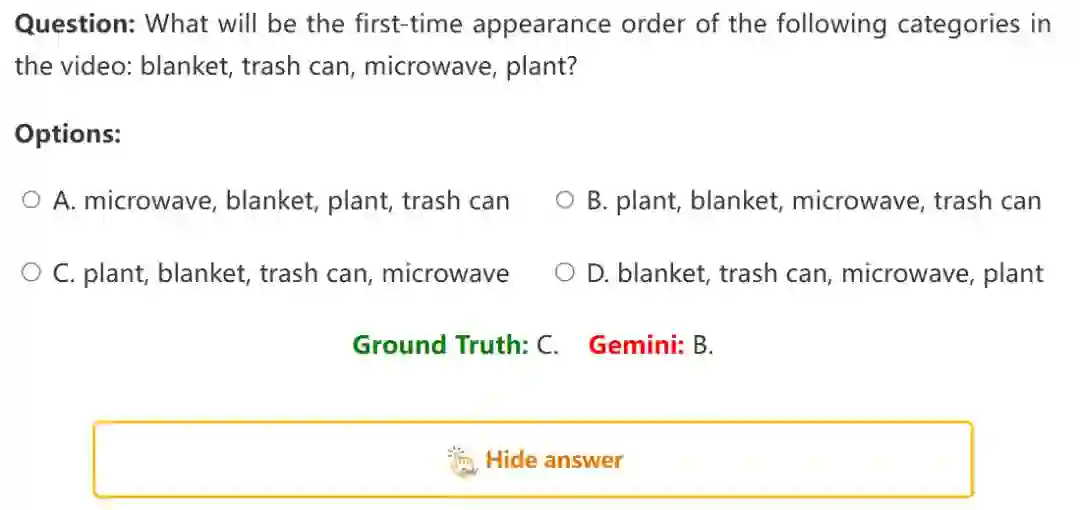 问:以下类别在视频中第一次出现的顺序是:毯子、垃圾桶、微波炉、植物?Gemini 给出 B 选项,正确答案是 C。