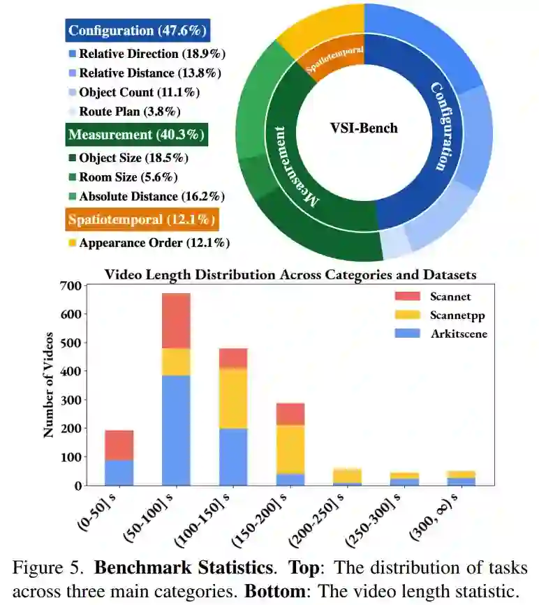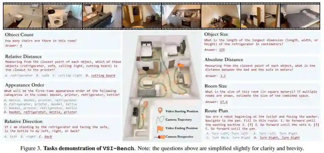 VSI-Bench 是一个用于定量评估从第一视角视频出发的 MLLM 视觉空间智能的工具。VSI-Bench 包含了超过 5000 个问答对,这些问答对来源于 288 个真实视频。这些视频包括居住空间、专业场所(例如,办公室、实验室)和工业场所(例如,工厂)—— 以及多个地理区域。VSI-Bench 的质量很高,经过迭代审查以最小化问题的歧义,并移除了从源数据集中传播的错误注释。 VSI-Bench 包括八项任务,如图 3 所示,包括:物体计数、相对距离、出现的顺序、相对方向、物体大小、绝对距离、房间面积、路径规划。 VSI-Bench 的任务演示。注意:为清晰简洁起见,上述问题略作简化。 数据集统计见图 5。