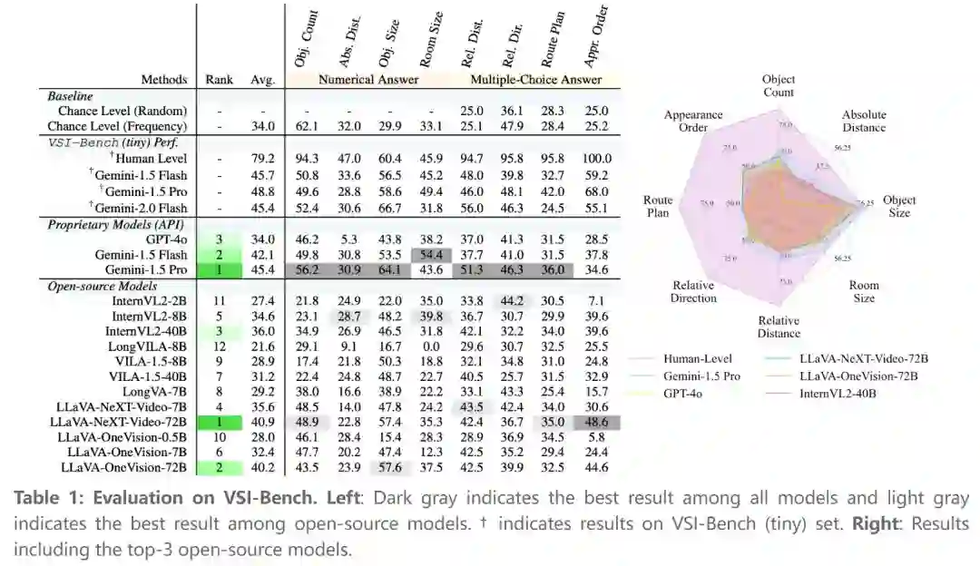 评估设置:本文对 15 个支持视频的 MLLM 进行了基准测试。专有模型包括 Gemini-1.5 和 GPT-4o。开源模型包括 InternVL2、ViLA、LongViLA、LongVA、LLaVA-OneVision 和 LLaVA-NeXT-Video 。 主要结果:通过 5000 多个问答对,作者发现 MLLM 表现出了有竞争性的视觉空间智能(尽管仍然低于人类)。Gemini Pro 表现最佳,但与人类的表现仍有差距。 具体而言,人类评估者的平均准确率达到 79%,比最佳模型高出 33%,在配置和时空任务上的表现接近完美(94%-100%)。 然而,在需要精确估计的测量任务上,差距缩小了,MLLM 在定量任务中表现出相对优势。 在专有模型中,Gemini-1.5 Pro 脱颖而出,尽管只在 2D 数字数据上进行训练,但它大大超过了机会基线,并在绝对距离和房间大小估计等任务中接近人类表现。 表现最佳的开源模型,如 LLaVA-NeXT-Video-72B 和 LLaVA-OneVision-72B,取得了有竞争力的结果,仅落后 Gemini-1.5 Pro 4%-5%。然而,大多数开源模型(7/12)都低于机会基线,暴露出视觉空间智能的明显缺陷。