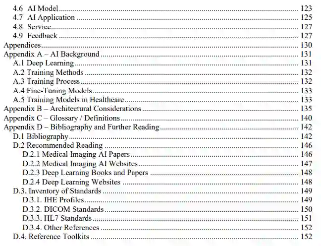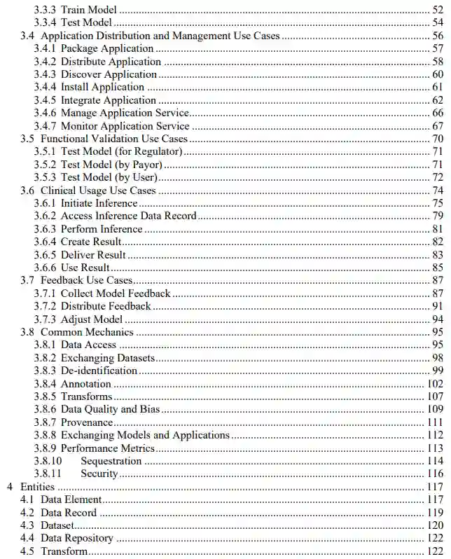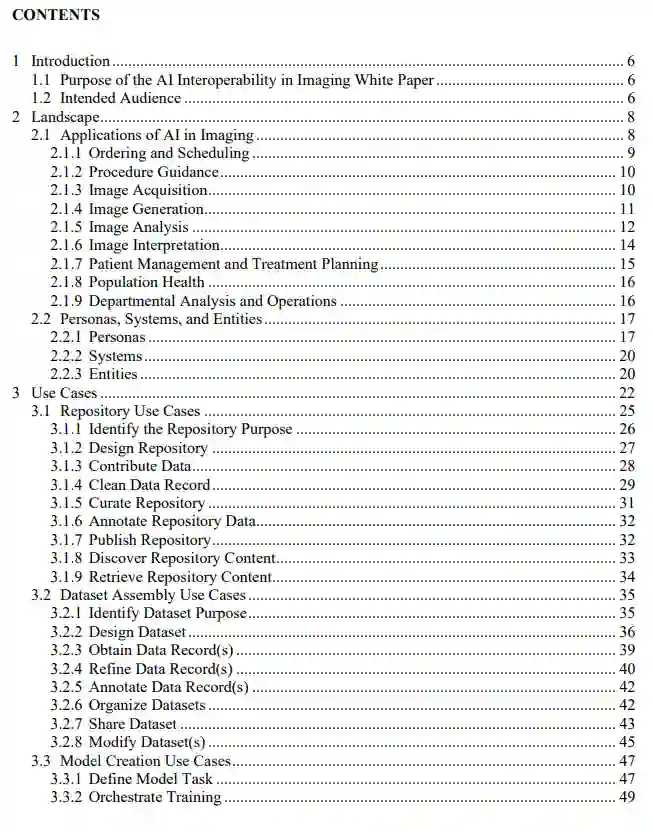 第2节描述了人工智能在影像学中的潜在应用,特别是要认识到从图像分析中生成候选临床结果以外的应用。还介绍了白皮书其他部分所提及的人员、系统和结构。第3节描述了为第2节所述的目的开发和使用人工智能时的步骤和互操作性需求。这些 "用例 "大致按时间顺序组织,从数据集储存库的建立和运行,到数据集的准备及其在训练和测试人工智能模型中的使用,再到训练过的人工智能模型的打包、部署、测试和临床使用。一个 "共同机制 "部分讨论了在多个用例背景下反复出现的主题。第4节是首次对与一些关键实体相关的元数据进行建模,如用例中出现的数据集、数据存储库和AI模型。