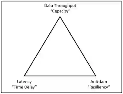 军事作战新技术的兴起,如人工智能、战术数据链(如Link 16和多功能先进数据链[MADL])和对手的电子战能力,为5G和FNC3等未来通信系统平衡这些能力带来了明显的挑战。人工智能和信息战可能需要大量的数据来实现预测分析,并让指挥官对战斗空间有一个准确的了解。与所有可用用户共享数据的数据链并不一定需要高数据速率;然而,数据链确实需要低延迟,以确保传感器能够证明 "目标级数据",特别是对于像巡航导弹和飞机这样快速移动的系统。最后,电子干扰器的扩散需要弹性(或抗干扰性能),以便在被主动干扰时保持通信。图7说明了在开发新的波形时必须平衡这三个相互竞争的要求(无论该波形是为民用还是军用而设计)。无线电信号能够提供每一种能力;然而,优先考虑一种要求意味着其他两种要求可能会受到影响,这可能会给决策者带来两难选择,即在采购中优先考虑哪些能力。