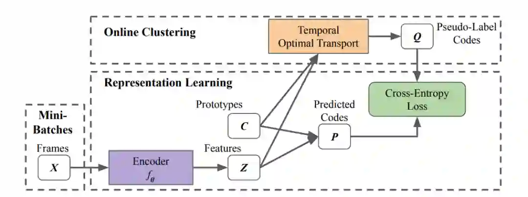 论文简介:提出了一种新的无监督活动分割方法,它使用视频帧聚类作为前置任务,同时执行表示学习和在线聚类。这与通常按顺序执行表示学习和聚类的先前工作形成对比。作者通过采用时间最优传输来利用视频中的时间信息,将保留活动时间顺序的时间正则化项合并到用于计算伪标签集群分配的标准最优传输模块中。时间最优传输模块使得本文方法能够学习无监督活动分割的有效表示。此外,与之前需要在离线聚类之前存储整个数据集的学习特征的方法相比,本文方法可以通过在线方式一次处理一个小批量。