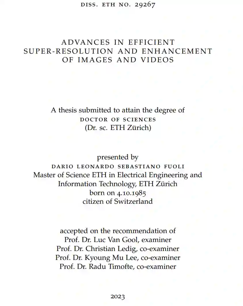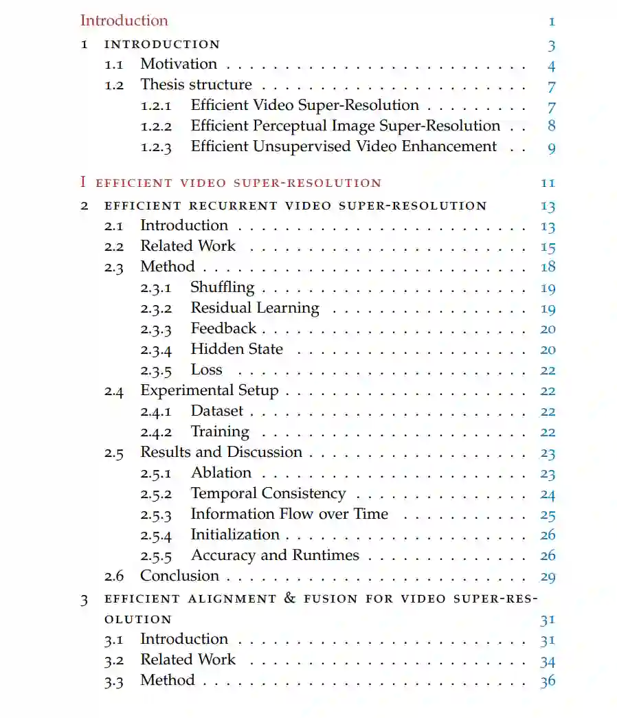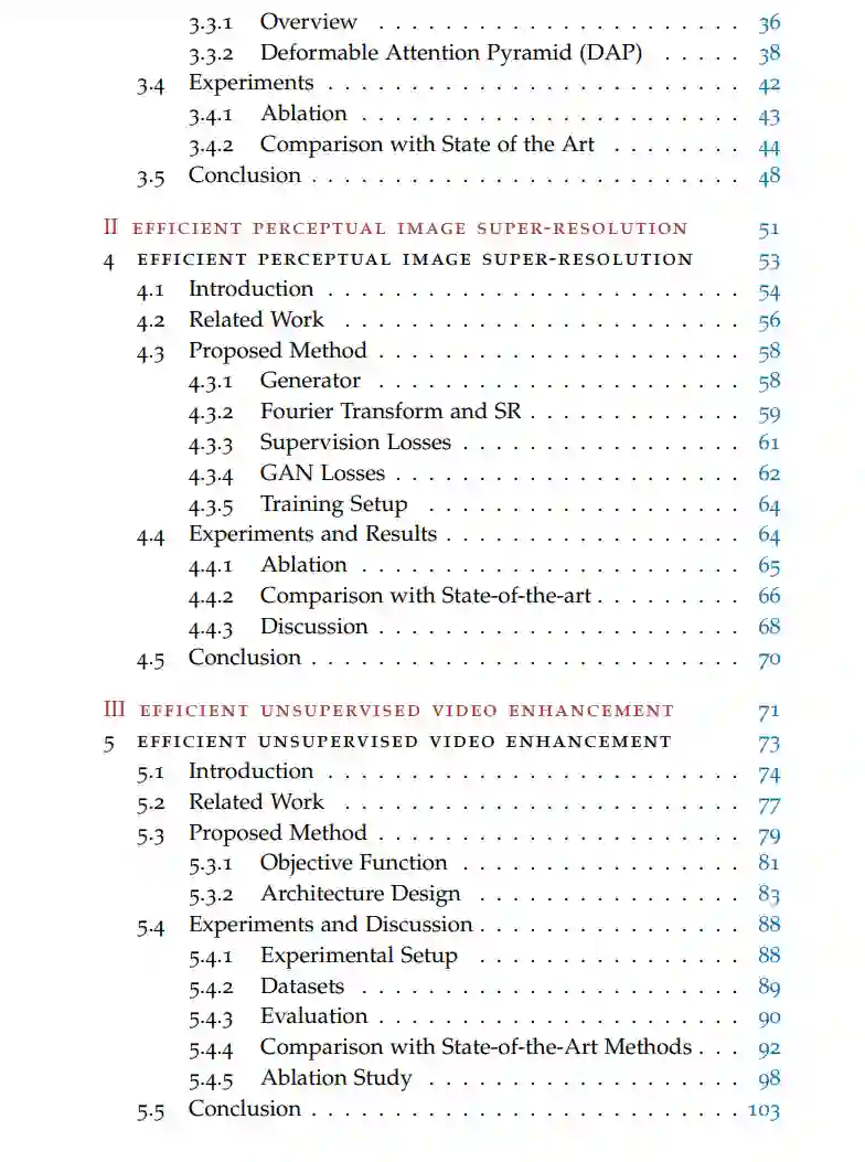 由于深度学习的革命性发展,计算机科学领域,尤其是计算机视觉在近年来经历了翻天覆地的变化。大多数经典算法已经被基于深度学习的方法所取代,并在性能上超越了它们。此外,新技术使得我们能够解决以前没有满意解决方案的新领域的问题。深度学习架构的性能与其计算复杂性密切相关,这使得开发高效的高性能算法变得复杂。本论文的目标是为高质量图像和视频增强任务开发具有最大性能的高效算法。这些特性在许多计算能力有限的设备(如电视或移动设备)的应用中需求很大。除了在第一部分针对恢复质量的快速算法外,第二部分和第三部分还提出了改进的学习算法,以促进以最大感知质量高效生成图像和视频。在第一部分,提出了两种高性能视频超分辨率的高效算法。首先,设计了一种循环算法,通过使用一种抽象的隐藏状态,尽可能高效地利用时间信息。该算法即使在连续帧之间没有明确的对齐时,也能在运行时间和性能上取得令人印象深刻的成果。其次,通过集成一个轻量级模块来同时对齐和融合时间信息,进一步改进了循环单元,该模块具有动态注意力机制。在第二部分,提出了一种用于改进感知图像超分辨率的算法。当算法被训练以直接最大化对原始图像的恢复时,结果往往会产生保守的高频估计。已经提出了专用的感知超分辨率损失,它以牺牲恢复质量为代价,以换取更合理的高频内容。为了进一步提高轻量级架构在感知上更加令人愉悦的图像超分辨率的训练指导,提出了在频域中使用额外的感知损失。在第三部分,通过提出一种高效的无监督视频增强算法来解决收集训练对的问题。通过使用循环的生成对抗性框架,实现了没有逐像素引导的数据学习。一个单一的循环判别器便于高效学习和在时间上一致的感知增强高分辨率视频的生成。增强器实现了高性能和快速的运行时间。总的来说,本论文中提出的架构和学习算法在实现轻量级和高质量图像和视频增强方面取得了显著进步。