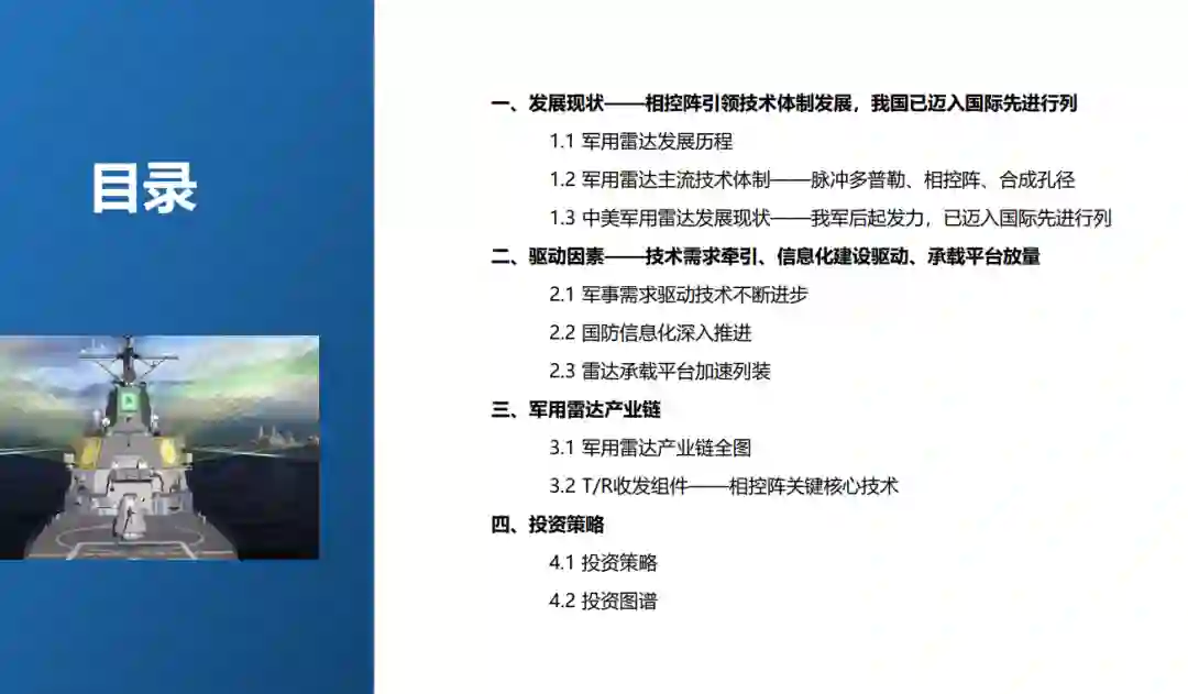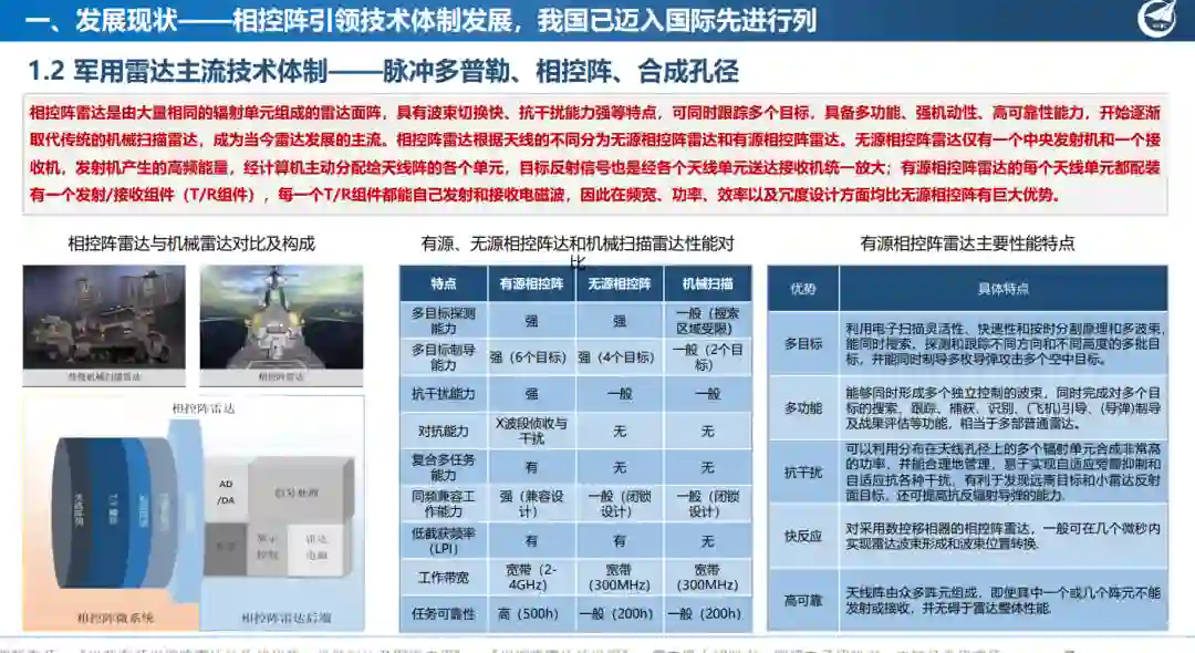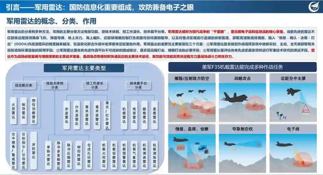 军用雷达是用于军事目标的雷达,是一种利用电磁波探测目标的军事设备,它通过发射电磁信号并接收从目标反射回来的信号测量目标的位置参数、运动参数并提取目标的有关技术。军用雷达是专门为特定的军事用途而设计制造的无线电探测和定位装置,它是获取陆、海、空、天战场全天候、全天时战略和战术情报的重要手段之一,是防天、防空、防海和防陆武器系统和指挥自动化系统的首要视觉传感器,因此在警戒、侦察、敌我识别等方面获得了广泛应用。雷达系统主要包括:产生高功率辐射信号的雷达发射机;向空间辐射信号和接收从目标反射信号的天线;将微弱的接收信号进行放大滤波和变换的雷达接收机;对雷达信号进行处理、录取与显示的雷达终端设备;控制雷达天线转动,控制与录取天线波束指向数据的雷达伺服设备;雷达各分系统协调工作的频率综合器和定时器等。 军用雷达的分类有多种方法,常用的主要分类方法有按功能、按技术体制、按工作波长、按承载平台等。军用雷达被称为现代战争的“千里眼”,是当前电子战和信息战的核心装备。当前先进的雷达不仅能够远程探测隐身飞机、弹道导弹、地上兵力、海上编队,还能够精确控制打击武器对目标跟踪制导,以及对重点区域进行连续的侦察监视,获取高清晰战场情报,融入“观察-确认-决策-打击”(OODA)作战流程环的程度越来越深,在信息化联合作战中发挥着举足轻重的作用。军用雷达的重要性主要表现在三个方面:①军用雷达是各级别作战指挥系统中能够实时、主动、全天候获取有关目标战场环境信息的探测手段;②军用雷达是各类先进作战平台不可或缺的组成部分,是实现远程打击、精确打击的必要手段;③军用雷达是评估各类先进武器系统和进行军事技术研究的测试手段。雷达作为战场侦察监视与情报搜索的主要战术装备,是战场态势感知和快速反应的主要技术途径,其性能与效能发挥决定我方力量战场战斗力和生存力。