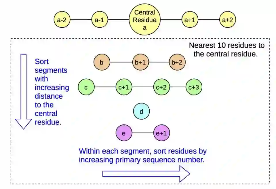 图2 结构基元选取示意图首先从一个残基出发,取最近的几个氨基酸残基作为起始残基,对于起始残基,会沿链的方向取相邻的残基,总数为十个,如图二所示。 2. 对于网络输出的不连续的物理量,模型会通过一个高斯核模型来统一描述: