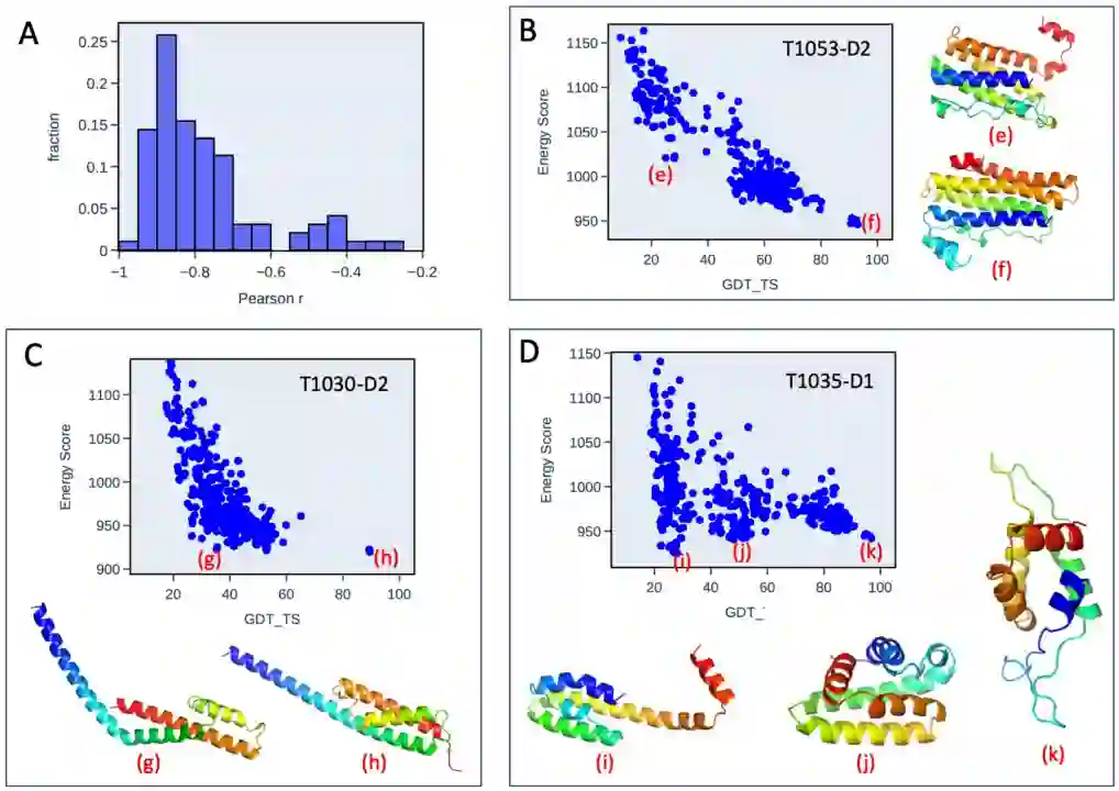 图3 NNEF打分能力评估算例 左:3DRobot诱饵集中一个典型的蛋白质打分的例子。右:简正模decoy集中一个典型的蛋白质打分的例子。红方块是native的结构,蓝点是decoy。在两个诱饵组的所有蛋白质中,可以看到能量随着与native构象与decoy的RMSD的增加而增加。 其次,作者利用NNEF充当蛋白质结构预测的打分依据: 图4 蛋白质结构预测打分测试CASP14中的结构预测评分,(A):CASP14中蛋白质的能量打分和GDT_TS打分之间的Pearson相关系数ρ的直方图。约70%的蛋白质具有Pearson相关系数|ρ|>0.75。B、C和D展示了三个例子,一些decoy的三维结构显示了它们在能量与GDT_TS的图中的位置指标。(B)中NNEF能量和CASP GDT_TS得分之间具有良好相关性。(C)展示了一个具有简单的α-螺旋的蛋白质的例子,在这种情况下,一些具有非native螺旋结构域的模型具有与接近native模型相当的能量。(D)展示了一个涉及到复杂二级结构中的蛋白质的例子。一些有错误折叠的模型的能量比相似于native构象的模型能量要低。然后,作者测试了NNEF评估MD轨迹内构象能量的能力: