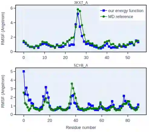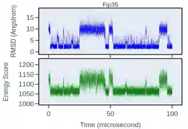 图5 Fip35的MD轨迹能量与RMSD示意图 作者根据模型的输出数据进行Langevin动力学模拟,按照下式更新蛋白质构象: 其中qi为第i个残基的位置向量,Ei为t时刻第i个残基的NNEF势能,Γ(t)为正态的高斯噪声,α和β为模拟的物理参数。图五展示了NNEF评估一个小蛋白Fip35的MD轨迹内的构型能量的算例。该蛋白质在模拟过程中经历了多次折叠和展开。RMSD和沿MD轨迹的能量具有很好的相关性,表明能量函数可以推广到非天然构象。有了以上结果,作者尝试使用NNEF力场与amber14SB力场同时对单链蛋白质体系进行动力学模拟: