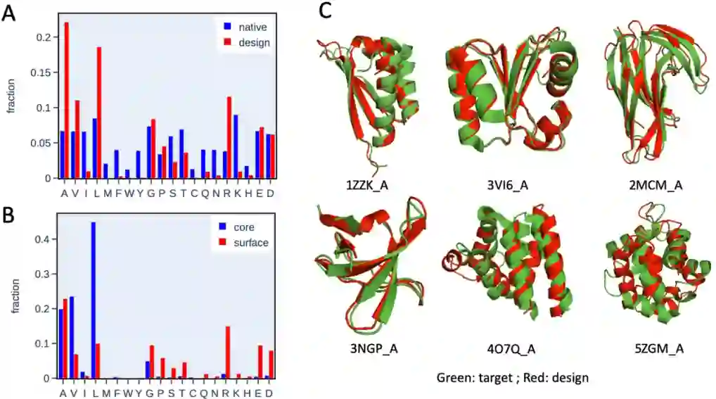 图7 序列设计测试图 (A):1800个设计序列和18个蛋白质的测试样本的天然序列(每个蛋白质100个序列)的氨基酸丰度直方图。设计的序列显示出对10种氨基酸(Ala、Val、Leu、Gly、Pro、Ser、Thr、Arg、Glu和Asp)的偏好性。(B):在所设计蛋白的核心和表面的残基的氨基酸频率。核心残基多为疏水基(Ala、Val和Leu),而极性残基主要分布在表面。(C):使用TrRosetta预测的目标结构和预测结构的几个例子。对于大约三分之二的设计序列,预测的结构可以匹配目标结构。 **——总结——**在本工作中,作者采取一种top-down的方式,使用无监督深度学习方法来推导描述蛋白质内氨基酸相互作用的统计势能,将蛋白质表示为包含三维空间中附近残基的组成块的集合,广泛地探索了每种构建块的构象空间。 目前类似的工作也是有的,但是模拟速度仍然受限,并且文章中对于模型怎么将不同的模块串联而进行总体能量更新的方式并没有详细的描述,训练方式与源代码也没有进行公布,这也是笔者对于该模型存在的一点疑问。 参考文献Huan Yang, Zhaoping Xiong, and Francesco Zonta. Journal of Chemical Theory and Computation[J]. 2022. Article ASAP DOI: 10.1021/acs.jctc.2c00069