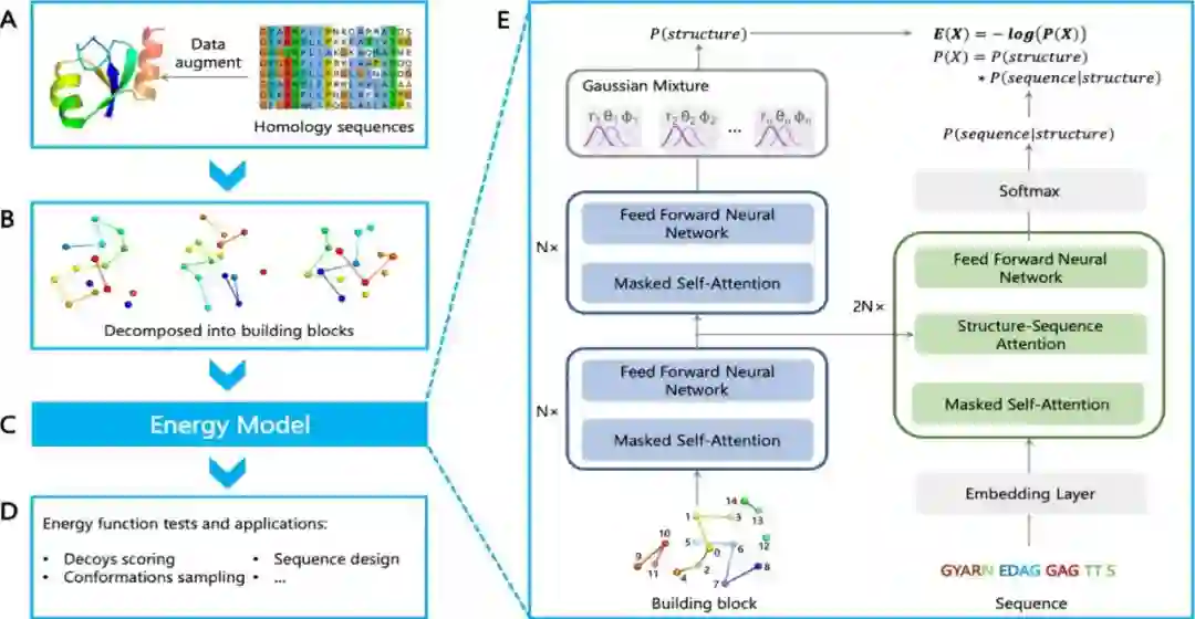对大型生物分子的精确计算建模应该涉及到量子力学(QM),但它的计算成本限制了这种方法的可行应用。基于近似经典势能的模型在描述生物大分子的动力学模型及如何相互作用方面更为成功。目前出现了两种主流的简化势能:基于物理模型的势能函数和基于知识的势能函数。这两种方法都依赖于物理直觉,将原子之间的相互作用映射为依赖于一组参数的简单函数形式,并通过QM和实验数据进行参数化。当然,对于一些特殊的体系,简单函数形式不能准确描述系统所需的所有细节。并且,基于经典势能函数的模拟对于较大的生物学体系,在计算上过于昂贵,不能总是达到与实验直接比较的时间和大小尺度,QM计算和混合方法(QM/MM)更是如此。 近年来,出现了将深度学习与基于物理的方法相结合的新方法。例如,在材料化学中,神经网络和量子蒙特卡罗方法已被应用于求解薛定谔方程,或通过拟合基于密度泛函理论或从头算分子动力学的计算来产生经典的原子力场。在蛋白质科学中,一些研究小组已经开发了用于蛋白质多尺度建模的神经网络能量函数,采用自下而上的方法,例如,将粗粒度势拟合到原子MD模拟中。尽管这些能量函数不能转移到不同的蛋白质系统中,但它们可能会导致未来力场参数化方式的范式转变。在本研究中,作者提出了一种自上而下的方法,并使用无监督的深度学习从实验数据(蛋白质结构和序列)中构建一个统计势。统计势并不是一个简单的函数形式,而是由一个深度神经网络来表示。 ——方法——