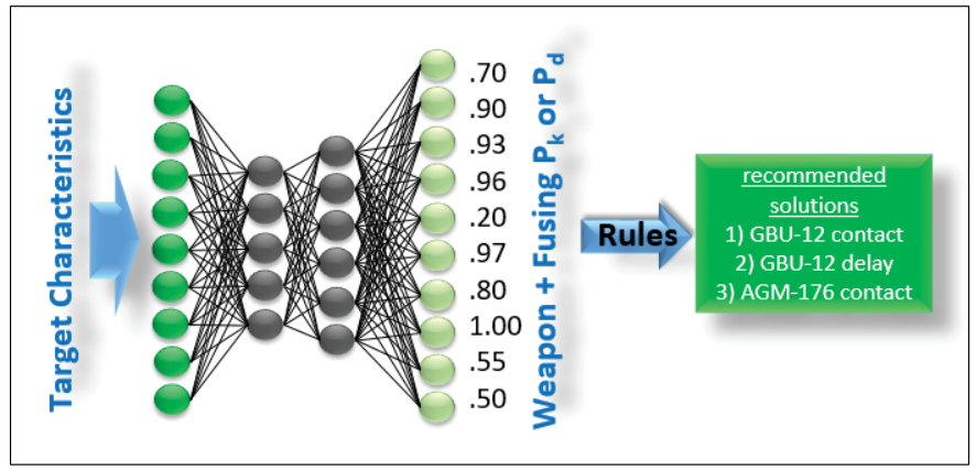 然后,该模型必须转化为决策或行动。人类必须决定如何对模型的输出采取行动。例如,该模型将产生一个分类或可能性,它可以为决策提供 if-then 场景或规则。在武器-目标示例中,模型将为每个武器和目标融合输出 Pk 或 Pd。适用于模型输出的有用规则包括相称性、附带损害最小化或武器稀缺性。这些规则可以对所需武器进行排序,并限制 AI 建议对每个目标使用核武器(核武器在图 7 中表示为 1.00 输出)。
