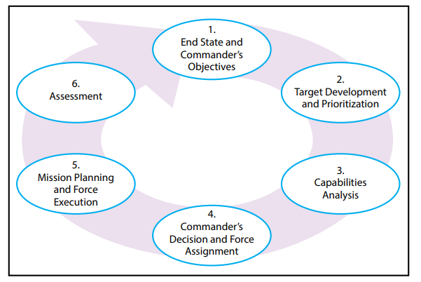 为了在联合目标选定循环(joint targeting cycle)中提高效率,流程中的各个步骤和步骤的自动连接必须提高效率。如图 1 所示,联合瞄准的六个阶段包括: