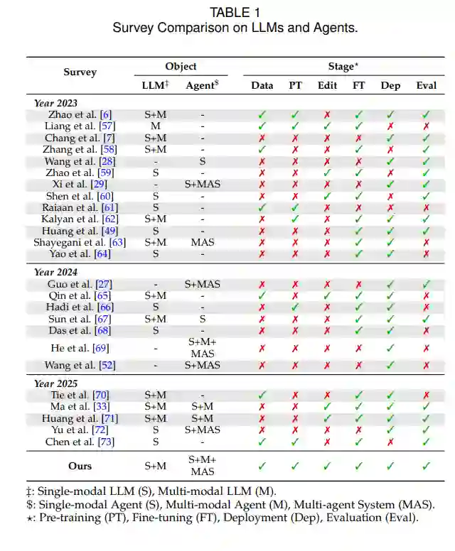 不幸的是,LLM的整个生命周期始终面临着安全性和可靠性问题[33, 34, 35]。在数据准备阶段,由于LLM需要大量且多样的数据,而大量数据来自互联网和其他开源场景,数据中的有害成分和用户隐私可能渗透到模型参数中,引发模型危机[36, 37, 38]。模型的预训练过程,由于其无监督性质,潜意识地吸收了这些有害数据和隐私信息,从而导致模型的“基因组”带有危险特征和隐私问题[39, 40, 41, 42]。 在模型部署之前,如果没有与安全措施妥善对齐,它很容易偏离人类价值观[43, 44]。与此同时,为了使模型更“专注”,微调过程会使用更安全且定制的数据,以确保模型在特定领域表现完美[45, 46, 47, 48]。模型部署过程还涉及越狱攻击等问题及相应的防御措施[49, 50, 51],尤其对于基于LLM的智能体[52],这些智能体可能由于与工具、记忆和环境的互动而受到污染[53, 54, 55, 56]。 之前的LLM调查主要集中在LLM本身的研究方面,往往忽视了对LLM安全的详细讨论[7, 34],以及对可信性问题的深入探索[74]。同时,现有的涉及LLM安全的调查大多侧重于各种可信性问题,或仅限于LLM生命周期的某个单一阶段[33, 75, 76],如部署阶段和微调阶段。这些调查通常缺乏对安全问题的专业研究,也缺乏对整个LLM生命周期的全面理解。表1总结了我们的调查与之前调查的差异。通过回顾上述调查并系统地研究相关文献,我们得出结论,我们的调查旨在解决现有调查未涵盖的几个问题: