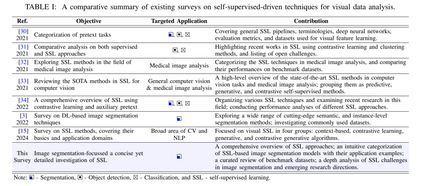 表I总结了已有的重要综述文章及其主要贡献。Chen 等人 [35] 回顾了心脏图像分割中的监督式深度学习方法;Minaee 等人 [3] 综合分析了图像分割相关的深度学习模型,探讨了其结构联系、优势与挑战;Liu 等人 [36] 则聚焦于脑肿瘤分割中的深度学习方法,涵盖了不同网络架构、不平衡数据下的表现及多模态处理策略。 然而,聚焦于自监督学习的综述研究仍然较少,且大多数侧重于分类 [30]、目标检测 [37]、图像识别 [31] 和遥感场景 [38]。Xu [32] 简要概述了若干自监督框架,并评估了其在医学图像基准数据集上的性能。部分研究探讨了 SSL 在下游任务中的领域适应性,如 Rani 等人 [39] 总结了这些任务及相关数据集;Hao 等人 [5] 按监督程度对语义分割模型进行了分类;Shurrab 和 Duwairi [33] 虽综述了医学影像中的 SSL 方法,但未对模型性能进行深入分析;Jing 与 Tian [30] 将自监督的预设任务分为四类,并对其效果进行对比。 尽管图像分割已是研究热点,现有综述多聚焦于监督学习方法,真正系统探讨自监督分割的文献仍非常有限,这凸显了开展本研究以弥补该空白的必要性。 本文结构如下:第二节介绍自监督学习的基本原理;第三节系统评述图像分割中的 SSL 方法;第四节列出主流基准数据集;第五节探讨当前挑战与未来研究方向;第六节总结全文。