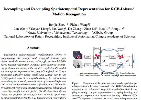 在行为识别领域,虽然当前的一些基于RGB-D模态的动作识别方法可以取得显著效果,但是他们都是建立在时空紧密耦合架构的基础上进行的时空信息建模。因此,这些方法主要存在以下三个问题:(1)由于时空建模过程的紧密耦合,导致在一些小数据集上面临一定的优化困难;(2)网络中包含的大量与分类无关的边缘冗余信息可能会误导分类器做出错误的决策;(3)视频多模态信息之间缺乏有效的时空交互导致后验融合机制不能充分发挥其作用。所以在本文中,我们提出了一种有效建模时空信息的解耦与重耦合机制以及一种新颖的RGB-D多模态时空信息交互策略。具体来讲,我们将多模态时空信息建模过程分成三个子任务:(1)通过解耦时空建模网络实现高质量维度无关的时间和空间表征学习。(2)重新耦合这些解耦的时空表征以重新建立强时空依赖。(3)引入一种新的跨模态时空信息交互方案和自适应后验融合机制(CAPF)来深度融合RGB-D多模态时空信息。通过充分利用以上技术,可以实现更加鲁棒的时空表征学习。