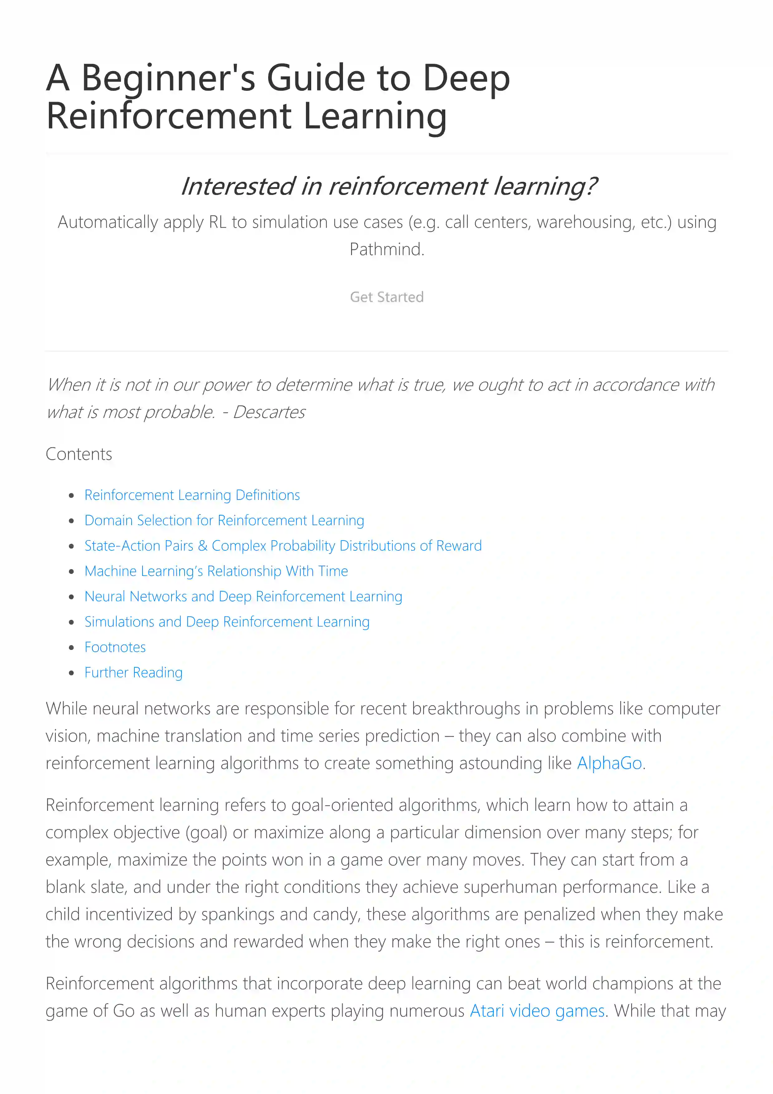 最近神经网络在计算机视觉、机器翻译和时间序列预测等问题上得到了重大突破,但它们也可以与强化学习算法相结合,创造出像AlphaGo这样令人震惊的东西。强化学习指的是面向目标的算法,它学习如何获得复杂的目标(目标)或在许多步骤中沿着特定的维度最大化;例如,在许多动作中最大化在游戏中赢得的分数。他们可以从一块白板开始,在适当的条件下,他们可以达到超人的表现。就像一个被鞭打和糖果激励的孩子,当他们做出错误的决定时,这些算法会受到惩罚,当他们做出正确的决定时,这些算法会得到奖励——这就是强化。包含深度学习的强化算法可以在围棋游戏中击败世界冠军,也可以在玩许多阿塔里电子游戏的人类专家。虽然这听起来微不足道,但与他们之前的成就相比,这是一个巨大的进步,目前的技术正在迅速进步。强化学习解决了将即时行为与其产生的延迟回报关联起来的难题。与人类一样,强化学习算法有时需要等待一段时间才能看到决策的成果。它们在延迟返回的环境中运行,在这种环境中,很难理解在许多时间步骤中哪些操作会导致哪些结果。强化学习算法可以期望在更模糊、真实的环境中执行得越来越好,同时可以从任意数量的可能动作中进行选择,而不是从视频游戏的有限选项中进行选择。也就是说,随着时间的推移,我们期望它们对实现现实世界中的目标是有价值的。Skymind将深度强化学习应用于真实世界用例的模拟,以帮助企业优化他们如何建立工厂、员工呼叫中心、建立仓库和供应链以及管理流量。