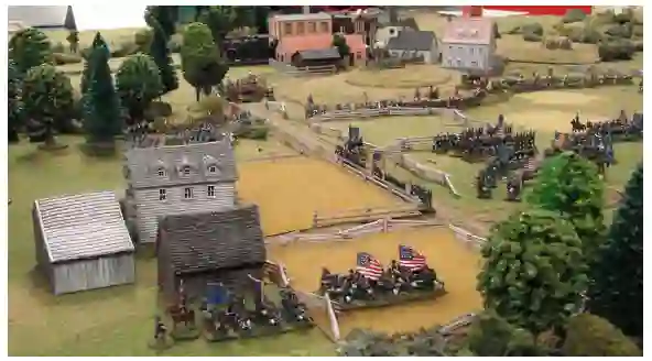 举个例子,在下图中,我在一张5'x6'的桌子上运行的拿破仑场景中,法国军队从左上方进入,而盟军从右下角进入。右上角的城镇和左下角的森林山丘导致行动沿着这两个主要地形特征之间的对角线发展。一些部队能够同时穿过城镇和树林,这使得侧翼不至于像桌子边缘那样被封闭,并且利用了整个7.5英尺的对角线尺寸的桌子。