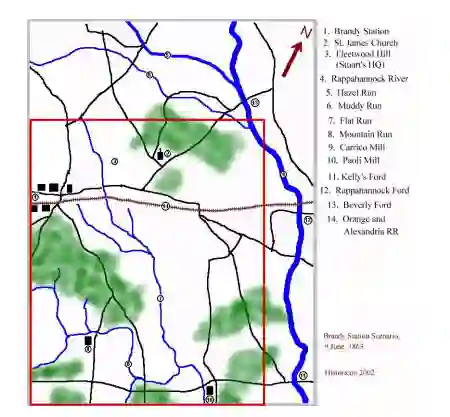 看着我最初为Historicon 2002的白兰地站战役制作的地形布,我在西南角选择了一个6英尺×5英尺的区域,这里用红色勾勒出来。