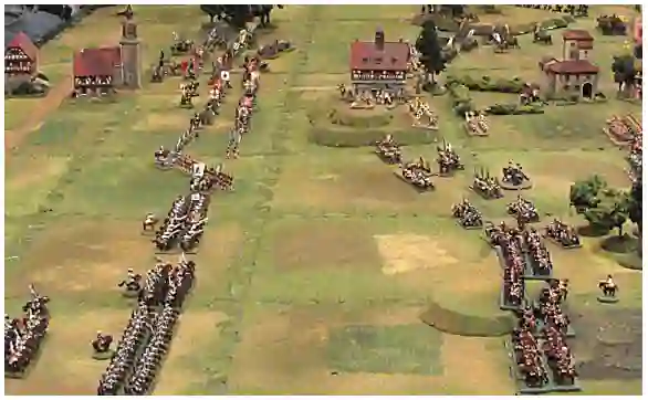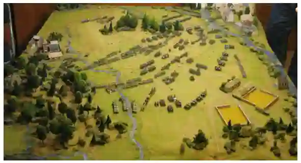 桌子上的地形元素的安排也可以对行动的方式产生重大影响。精心布置的树林和村庄可以引导行动并为行动提供焦点。虽然作为入口的道路的位置肯定会决定部队的部署方式,但位于桌子中间的道路的位置就不那么关键了,因为当部队到达那里时,他们通常已经部署好战斗,不再能够利用路网。