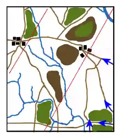 这个场景的地形安排应该为连续的后退阵地提供机会,即分散的树林或村庄,当防守部队被击溃、被包抄或被逼退时,可以利用这些阵地。