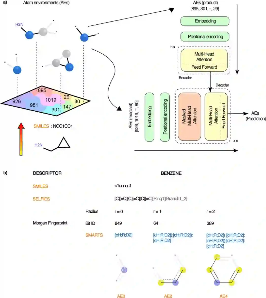作者使用原子环境(AE)替代SMILES进行逆合成预测,AE是指以特定原子为中心,不同“半径”的圆形拓扑邻域片段,也包含所涵盖原子之间的所有化学键。其中,“特定原子”称为中心原子,“半径”指的是中心原子和所有共价键原子之间允许的最大拓扑距离。因此半径为 r 的AE包含分子中与中心原子的拓扑距离为 r 或更小的所有原子,以及它们之间的所有键。根据定义,r = 0 的AE只包括中心原子类型的原子,表示为AE0。r = 1的AE包含中心原子、与中心原子相邻的所有原子,以及中心原子与这些原子之间的所有键,表示为AE2。如图1(b)所示,化合物苯的文本描述是以常见的SMILES、SMARTS模式,和新开发的SELFIES模式,以及代表ECFP指纹的AE。 图1(a)提供了该模型的整体流程。首先将产物分解为一组AEs。由SMART模式描述的每个AE都与一个特殊的整数值有关。将AEs列表作为模型RetroTRAE的输入序列,用该模型来预测反应物的AE序列。