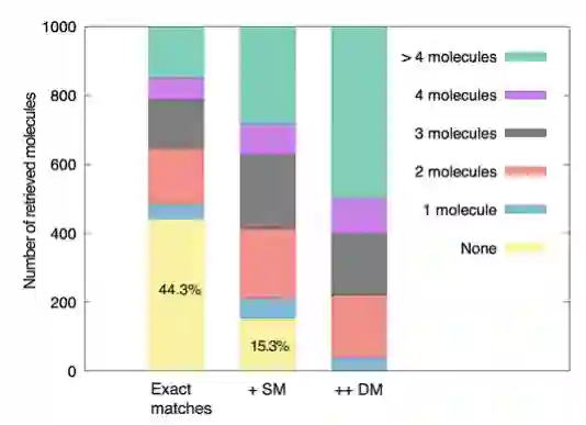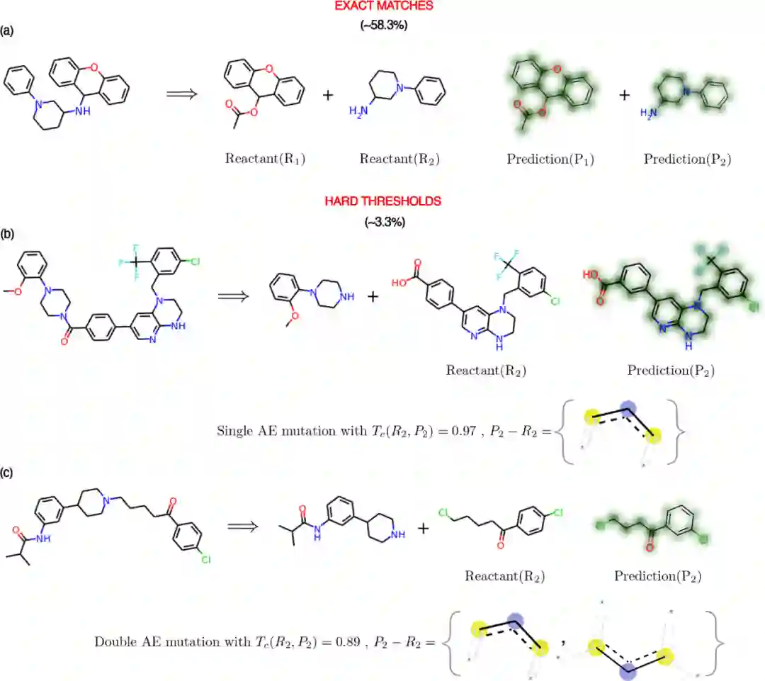 使用RetroTRAE模型进行预测后,得到的结果是预测反应物的AE的集合,可以通过数据库搜索来检索,成功检索到即证明模型预测的AEs可以完全还原为真实分子或高度相似的分子。作者使用PubChem研究了1000个USPTO测试分子检索反应物候选的成功率。检索测试结果显示,超过一半的预测(55.7%)可以被准确检索(图4)。允许SM后,检索成功率提高了约30%。当允许DM时,所有的测试分子都能被成功检索到。这证明模型得到的所有结果最多只有两个AE的差异。以上结果表明,用AEs表示和预测分子是一种可行实用的方法。
