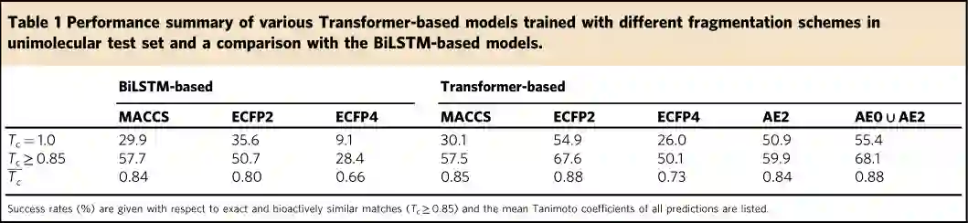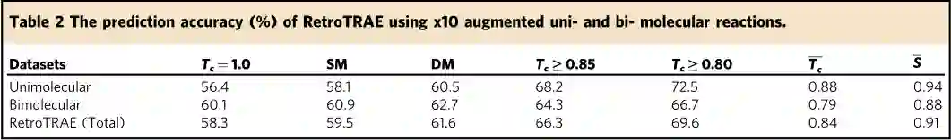 找到一组最准确地代表分子结构的最佳片段是提高逆合成预测性能的关键因素。因此作者使用多个不同的分子片段描述在单反应物测试集中进行逆合成预测评估。如表1所示,作者一共选择了三种分子片段的描述方法进行比较,并分别使用不同的模型框架,性能评价选择衡量相似度的谷本系数(Tanimoto Coefficient, Tc)。 首先,基于Transformer的逆合成模型,在准确性方面与以前基于BiLSTM的方法相比有很大的改进。其次,在MACCS、ECFP2、ECFP4、AE2、AE0∪AE2几种不同的分子片段描述方法中,基于AE0∪AE2的分子Transformer模型性能最佳,达到了55.4%的精确匹配精度。增加生物活性相似的预测(Tc ≥ 0.85)后,准确率也相应提高,模型的总体准确率达到68.1%。因此,作者把具有AE0和AE2联合的Transformer模型命名为RetroTRAE。 表1 在单反应物测试集中使用不同分子片段方案训练的Transformer模型的性能总结以及与基于BiLSTM的模型的比较******[1]**********