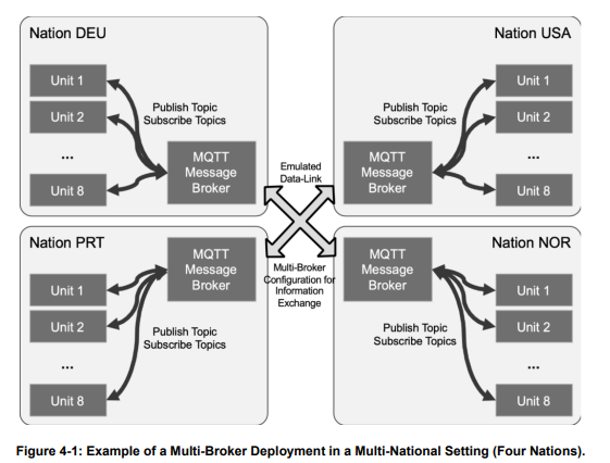 下一步是使用第3章中的数据格式进行实验,并通过概念验证试验来展示将民用物联网与军事指挥控制系统集成的益处和能力。该数据格式承载应用信息。为了在联盟国家间进行通信,仅商定格式是不够的,还必须采用能够传播数据的网络协议。基于IST-150小组“混合战术网络的北约核心服务规划”[6]的建议,我们研究了MQTT协议。第4章涵盖了基于MQTT的联合实验。