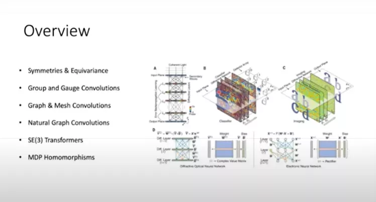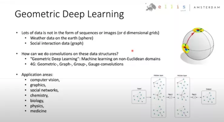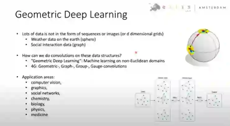 在这次演讲中,我将介绍下一代的图神经网络。GNN具有对图中节点的排列和图的整体旋转不变的特性。我们认为这是不必要的限制,在这次谈话中,我们将探索这些GNN的扩展,以更灵活的等变结构。特别地,一般图的自然图网络在节点排列下是全局等变的,但仍然可以通过本地消息传递协议执行。我们在流形上的mesh-CNNs在SO(2)规范变换下是等变的,因此,与常规的GNN不同,它具有非各向同性的核。最后,我们的SE(3)转换器是局部消息传递GNN,对排列不变性,但对全局SE(3)变换是等价的。这些发展清楚地强调了几何和对称作为图(或其他)神经网络设计原则的重要性。