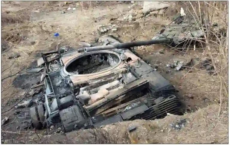 图:2022 年 3 月 7 日,在乌克兰马里乌波尔拍摄的一辆被摧毁的俄罗斯坦克。(照片由乌克兰内务部提供,维基共享资源)