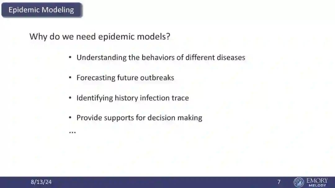 大规模流行病建模 * 流行病学中的跨模态应用 * 流行病扩散过程 * 流行病干预措施 * 生成可解释的预测 * 解决流行病数据中的挑战