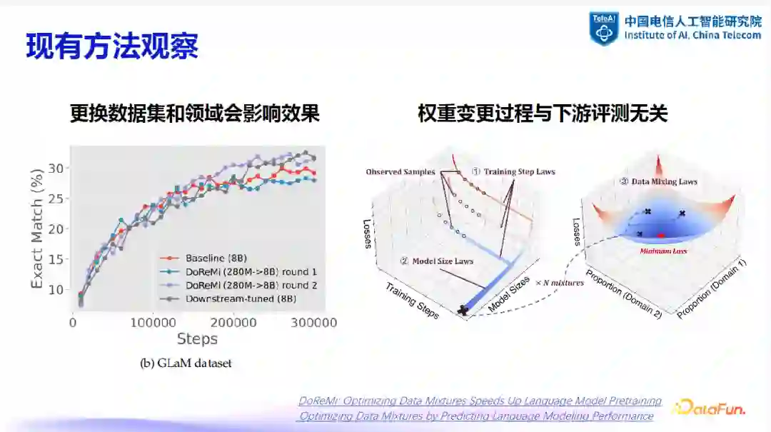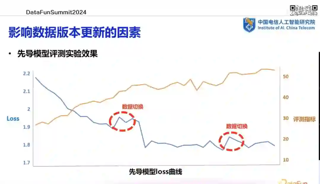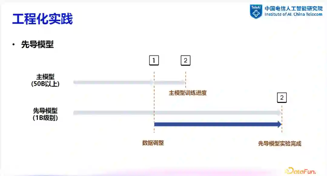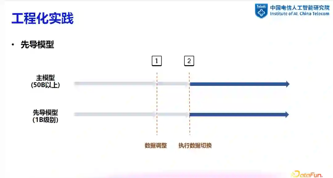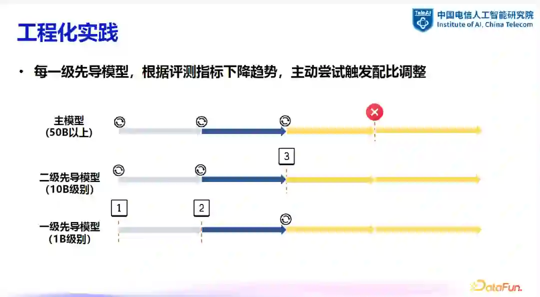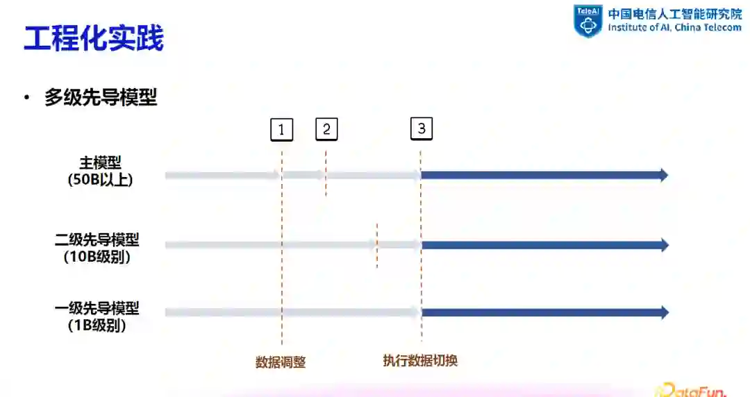 在工程实践中,常用的方法是训练一个先导模型来监控数据变化并及时作出调整。先导模型的规模通常较小,如 1B 参数级别。当需要调整数据时,可通过先导模型进行一系列实验,包括数据去重、清洗及配比调整等,并对效果进行评估。一旦确定可行方案,即可同步应用于主模型。在某些情况下,一级先导模型可能无法完全满足数据调整的需求,这时可能需要二级甚至多级先导模型来进行更细致的追随训练。在多级先导模型的设置中,可能需要进行二次甚至多次的先导实验,以确保决策的准确性。这种多级实验虽然增加了时间和算力成本,但在减少 token 消耗的同时,提高了实验结果的可靠性。